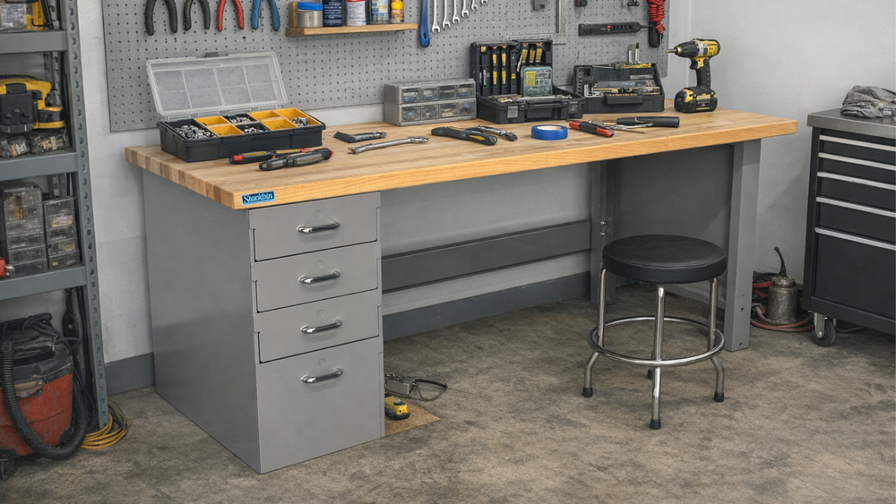 Maximize your floor space with Stackbin’s Cabinet and Drawer Pedestal Workbenches. These units combine the legendary, rugged steel construction of our industrial frames with the high-density storage of an enclosed base. Whether you need the open organization of an enclosed cabinet or the precision tool management of our heavy-duty roller bearing steel drawers, these benches are built to provide a rock-solid foundation for the toughest tasks. By integrating storage directly into the bench pedestal, you eliminate the need for secondary tool chests and keep your most valuable equipment secure, organized, and immediately accessible.
