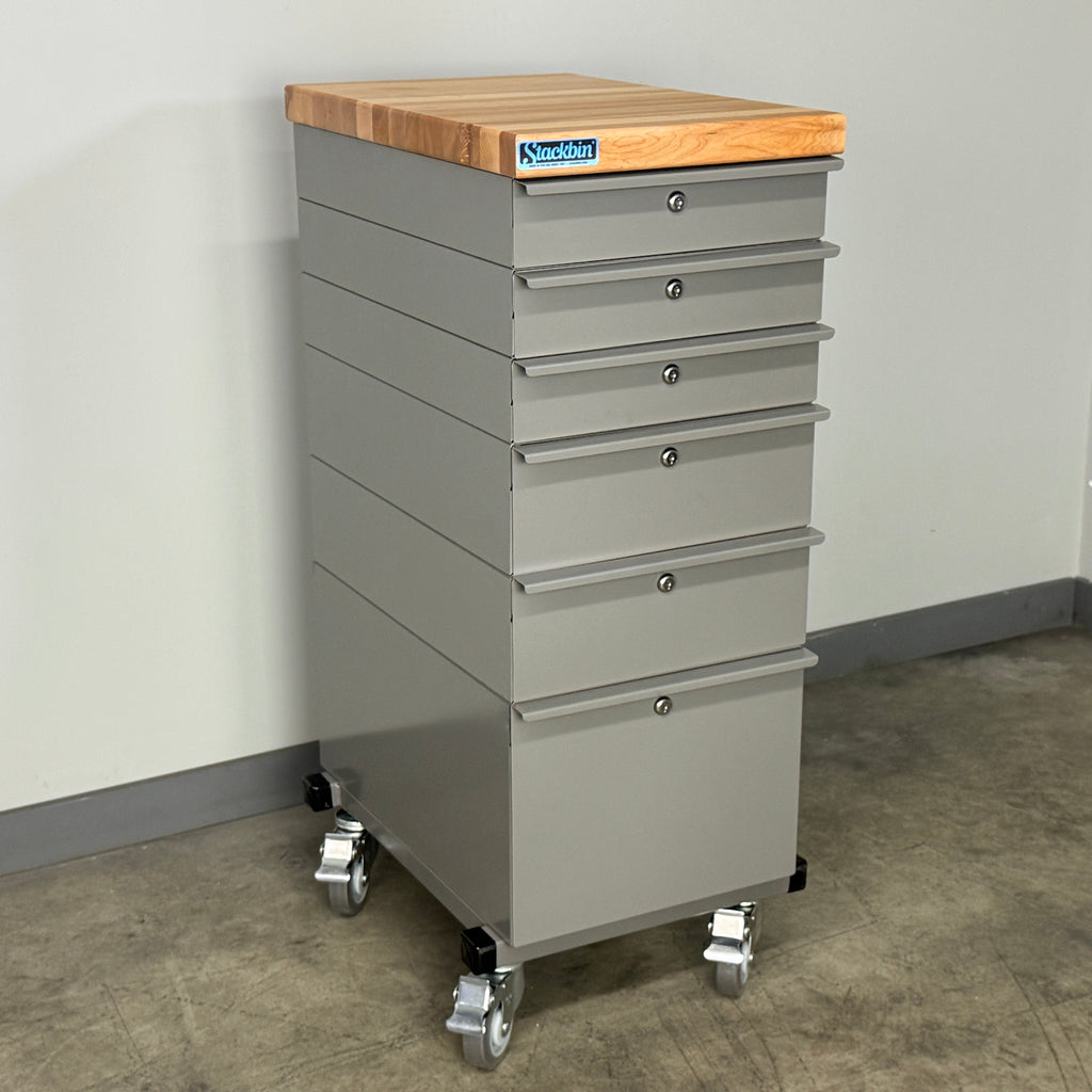 Stackbins' stackable roller-bearing drawer systems are available in 6 sizes and with two different drawer front options. Each drawer is a separate unit which includes a roller bearing drawer and a full case which means that these drawer systems can be added to or reconfigured at any time. Manufactured of 18 gauge steel, Stackbin roller-bearing drawers open and close effortlessly and lock into place when closed. High-quality brushed aluminum handles included with each drawer and optional locks are available.