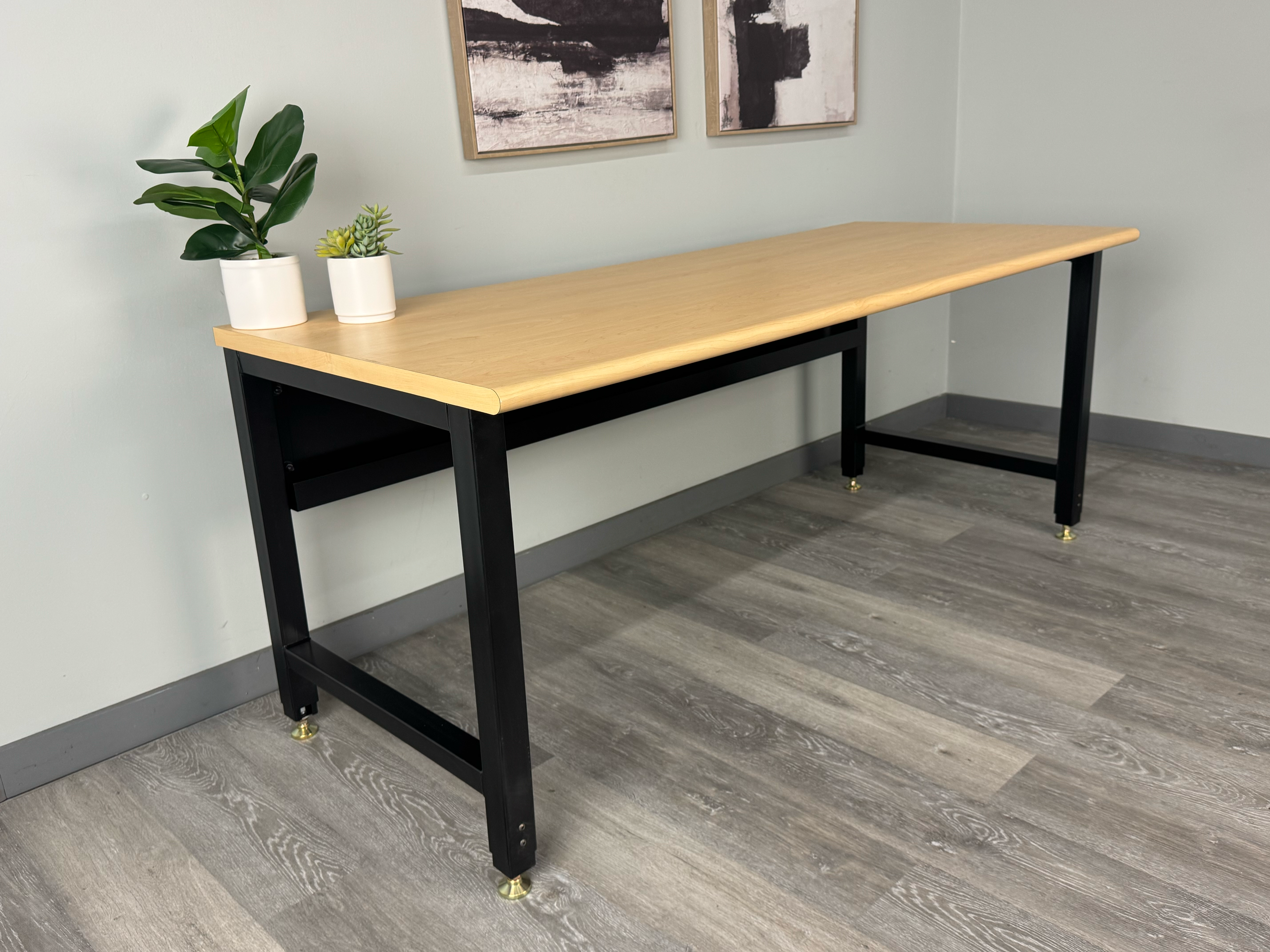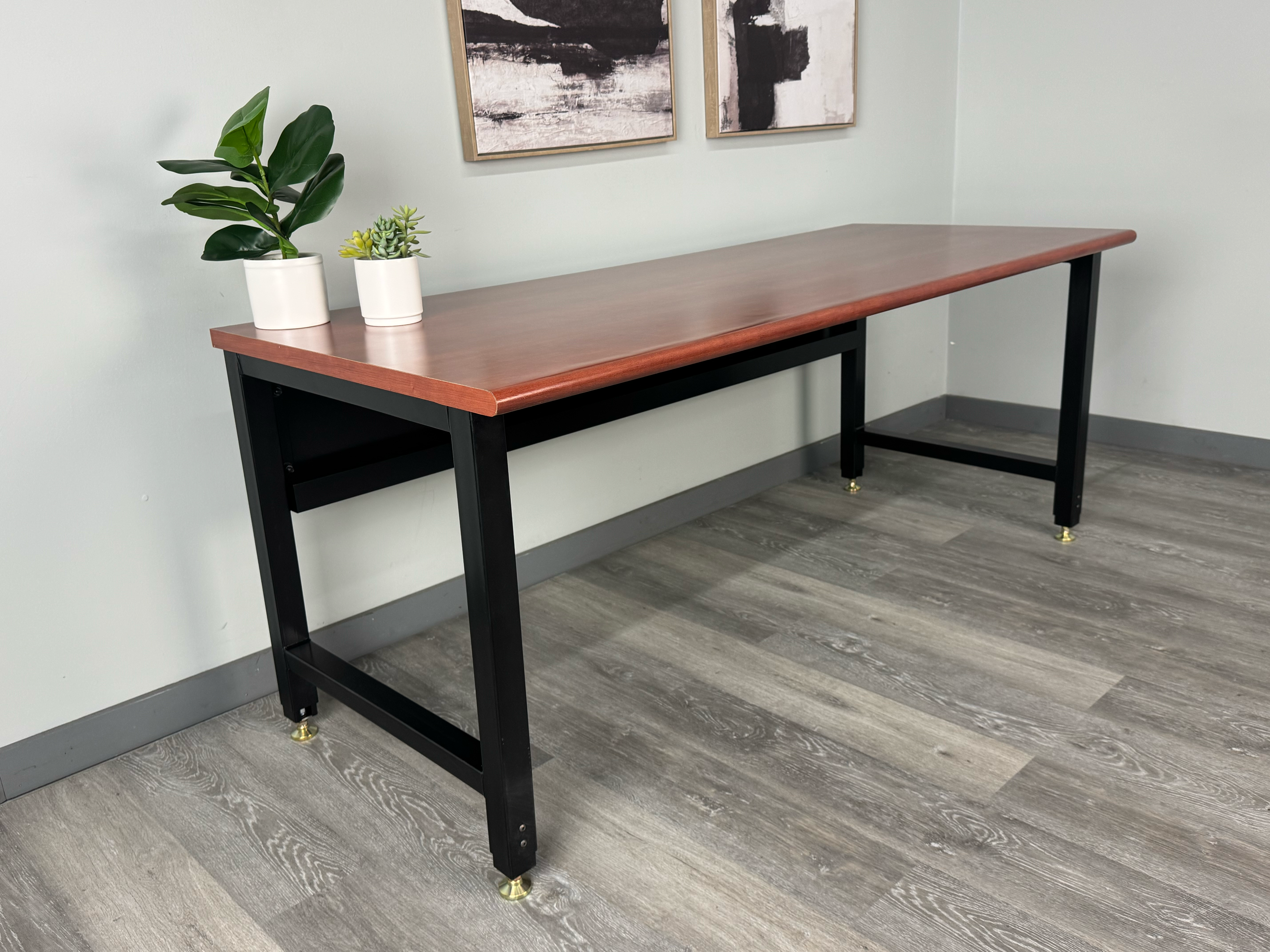 Elevate your workspace with the Modal Series Office Desk, proudly made in the USA and engineered for long-term reliability. A welded 14-gauge steel leg design delivers exceptional strength, while heavy-duty gold glides and a bolt-together frame make setup fast and hassle-free. The sturdy 1-1/4" laminate top offers a smooth, professional worksurface, and the built-in wire trough keeps cables neat for a clean, productive environment.