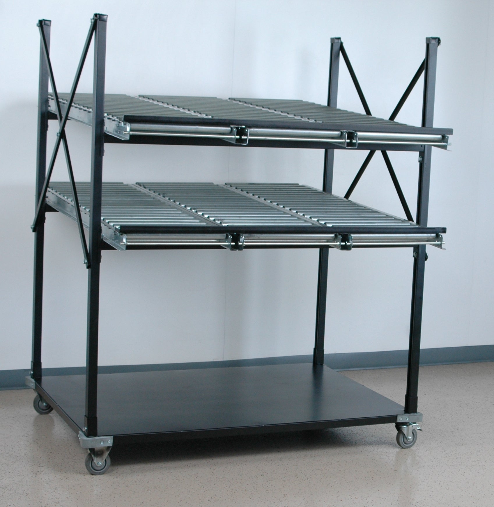 Each level includes skate-wheel conveyor sections mounted on support rails that can be set flat or angled. Both levels offer fully adjustable height and roller overhang to fine-tune ergonomics for a wide range of goods that roll smoothly. Finished in durable baked enamel, this 48-inch-deep rack delivers flexible, space-efficient product handling in manufacturing and distribution operations.