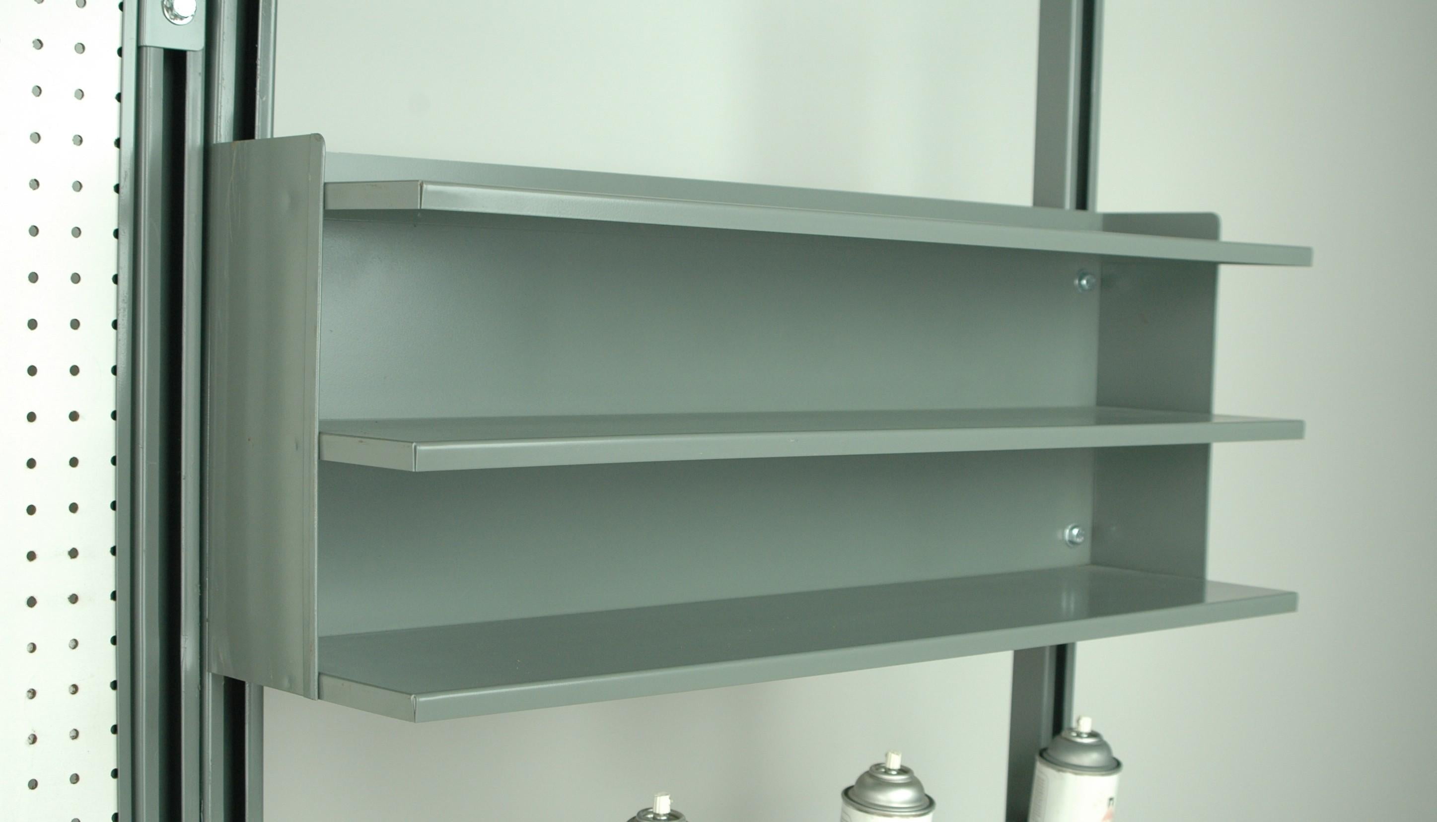 • Three light-duty shelves sized for small items, parts, and packaging supplies.