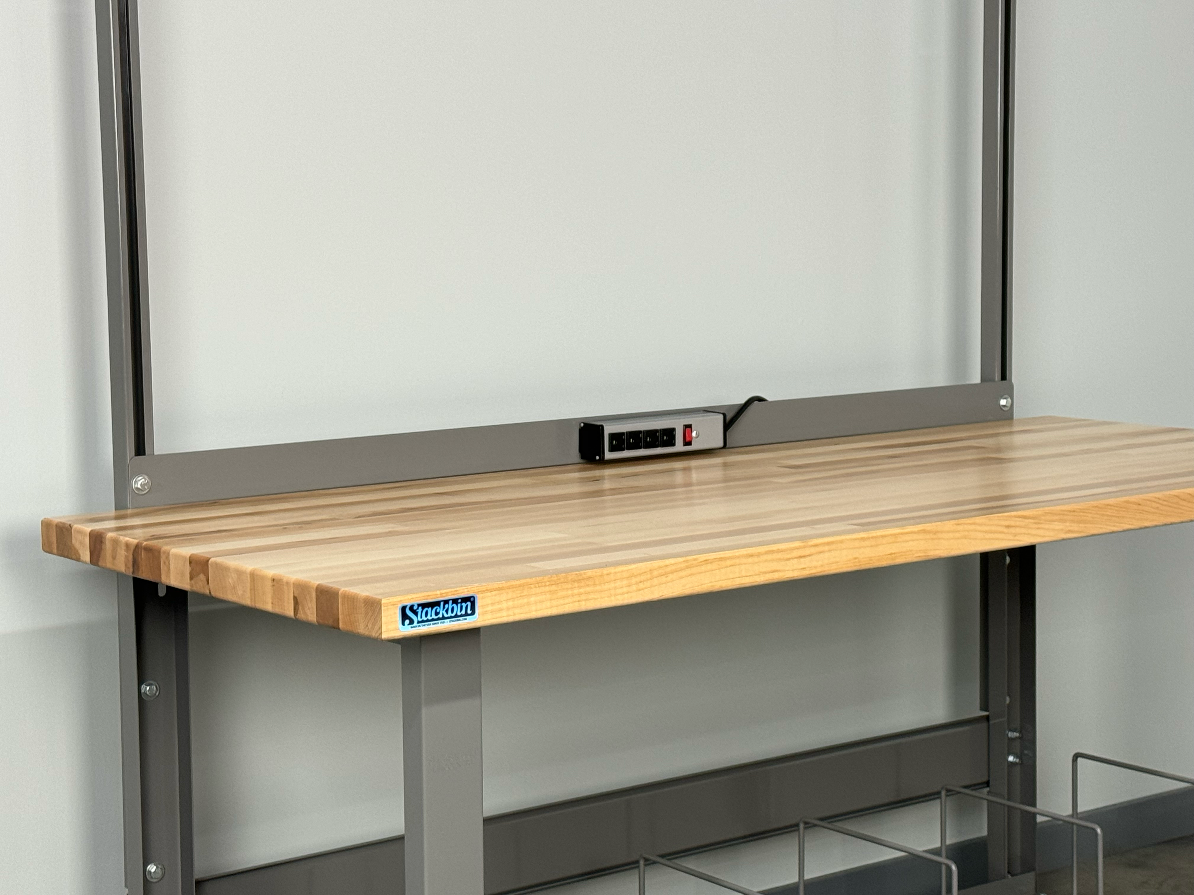 This power strip mounts directly to the standard bin rail on any Stackbin workstation with an overhead structure. It slides onto the rail for secure, tool-free installation, keeping your work surface clear while providing easy access to power.