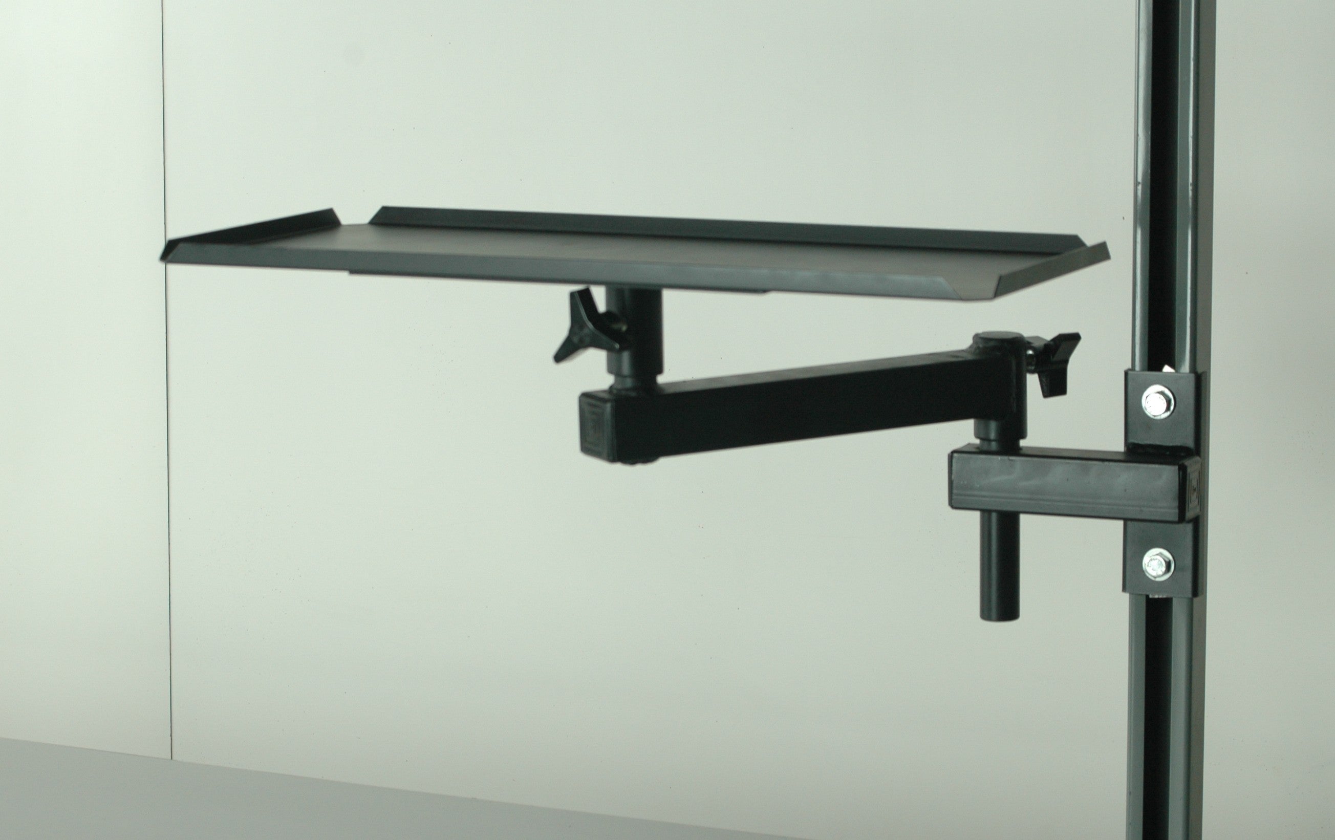 The tray is mounted on a 10-inch swing arm that allows it to articulate up to 15 inches from the support mount, giving you flexible positioning to place supplies exactly where you need them on your packing bench.