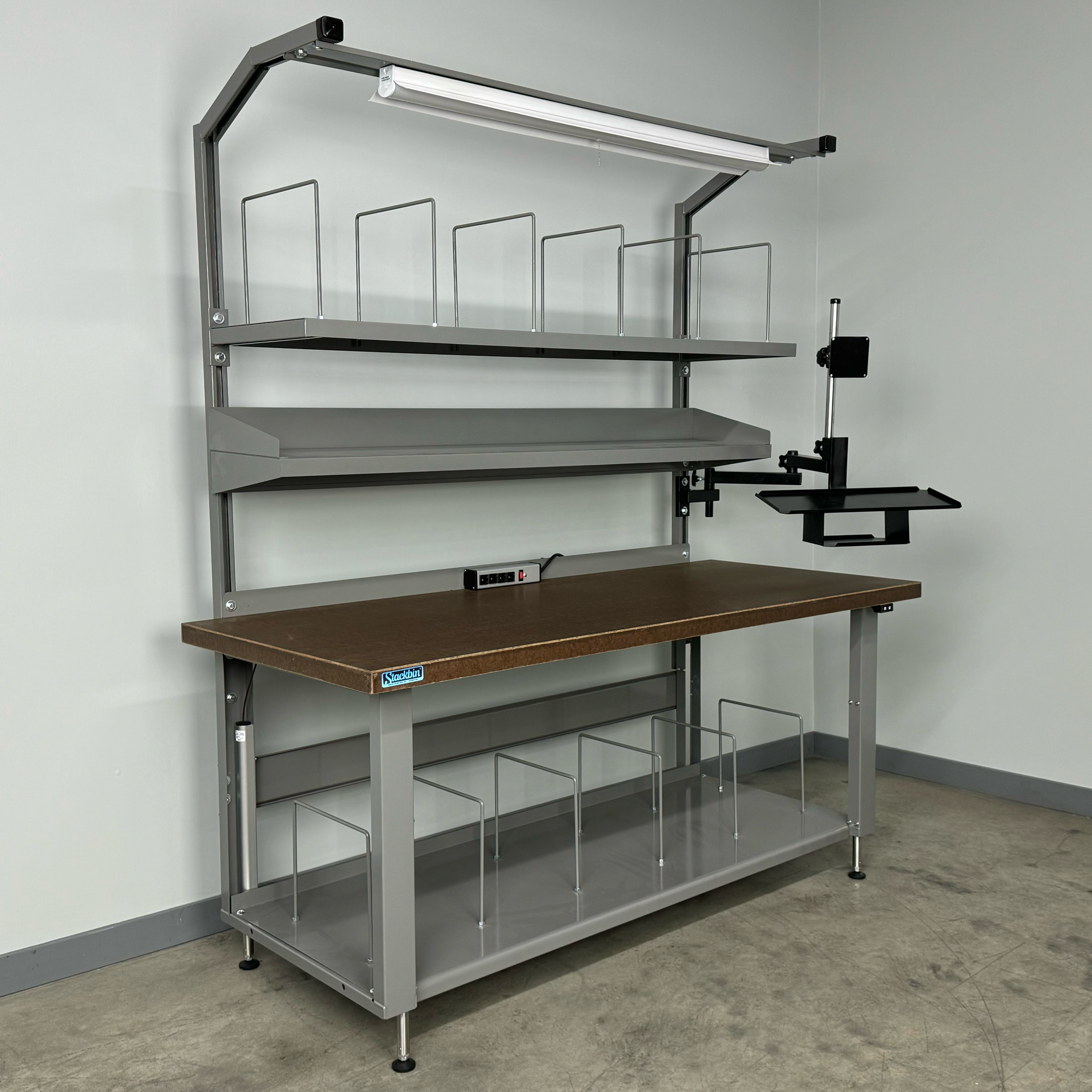 Engineered with an angled overhead structure and integrated light support, it delivers clear visibility at the workstation. The electric hydro lift offers effortless, 12-inch height adjustability, allowing users to set the perfect working position at the touch of a button—ideal for multi-user stations and continuous-use shifts. A full-depth bottom surface provides dependable space for supplies and equipment, while the adjustable steel shelf and 4-way spool holder keep packing materials neatly within reach. The flat-screen monitor mount with keyboard and mouse tray supports digital workflows, and the rear-mounted power strip makes it simple to connect essential devices.