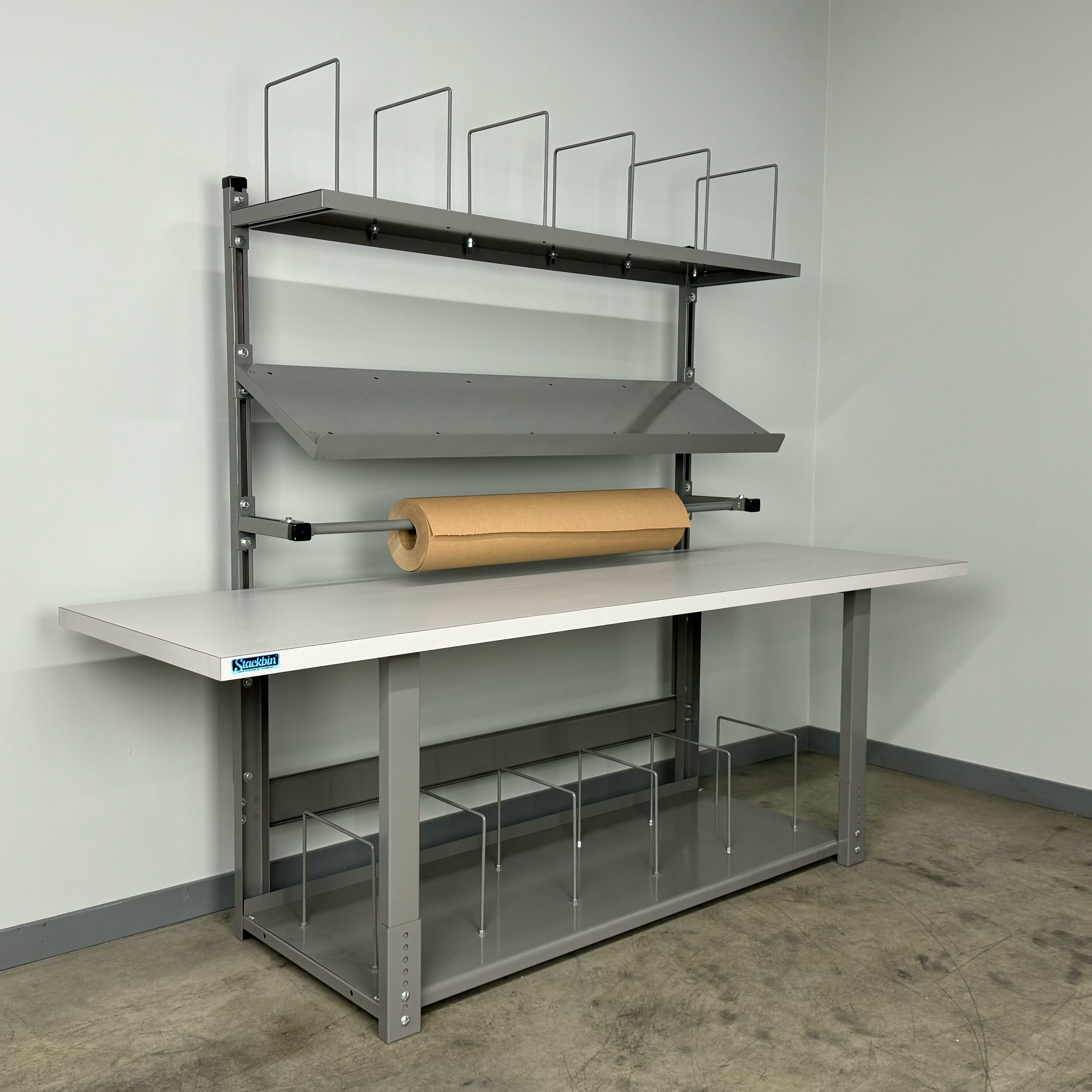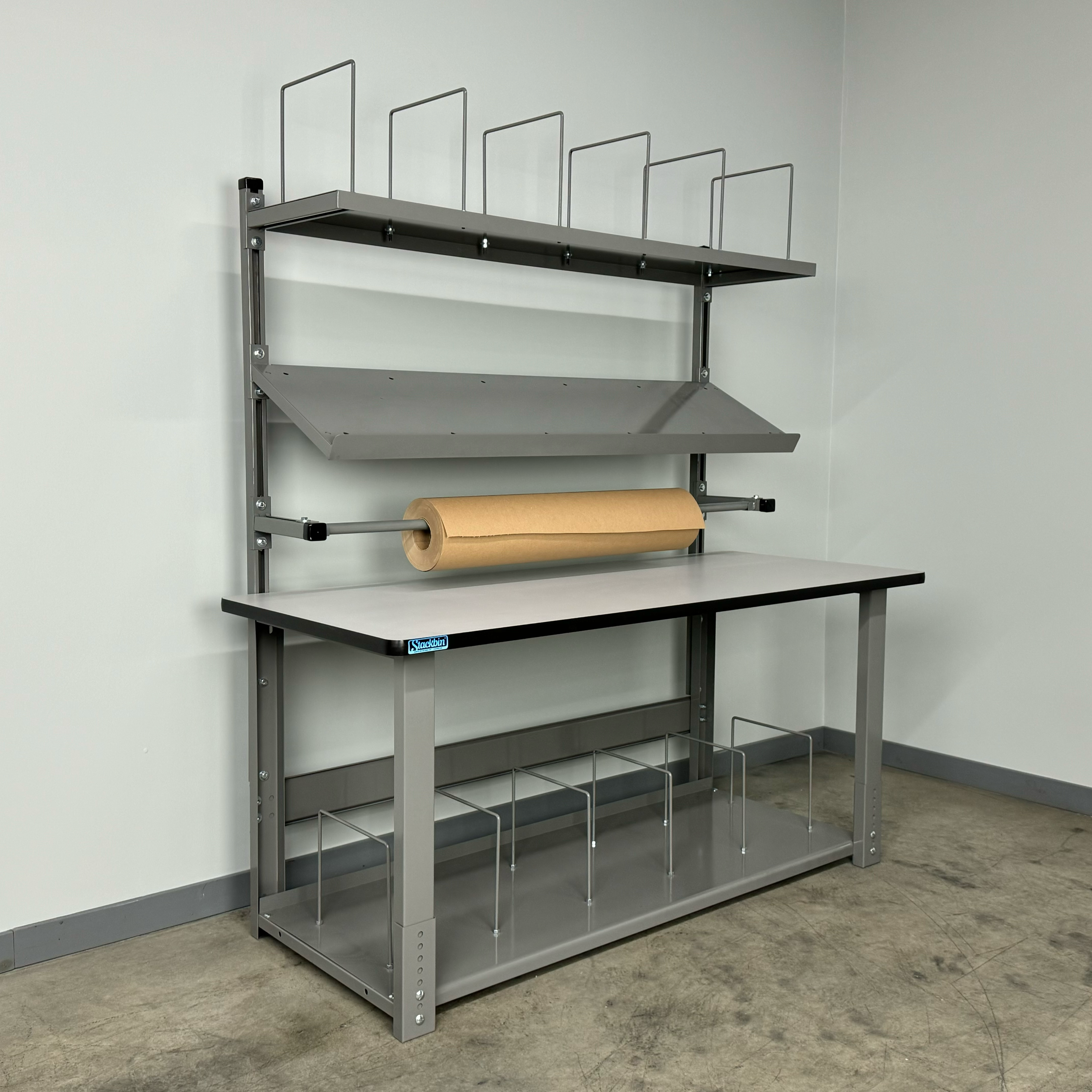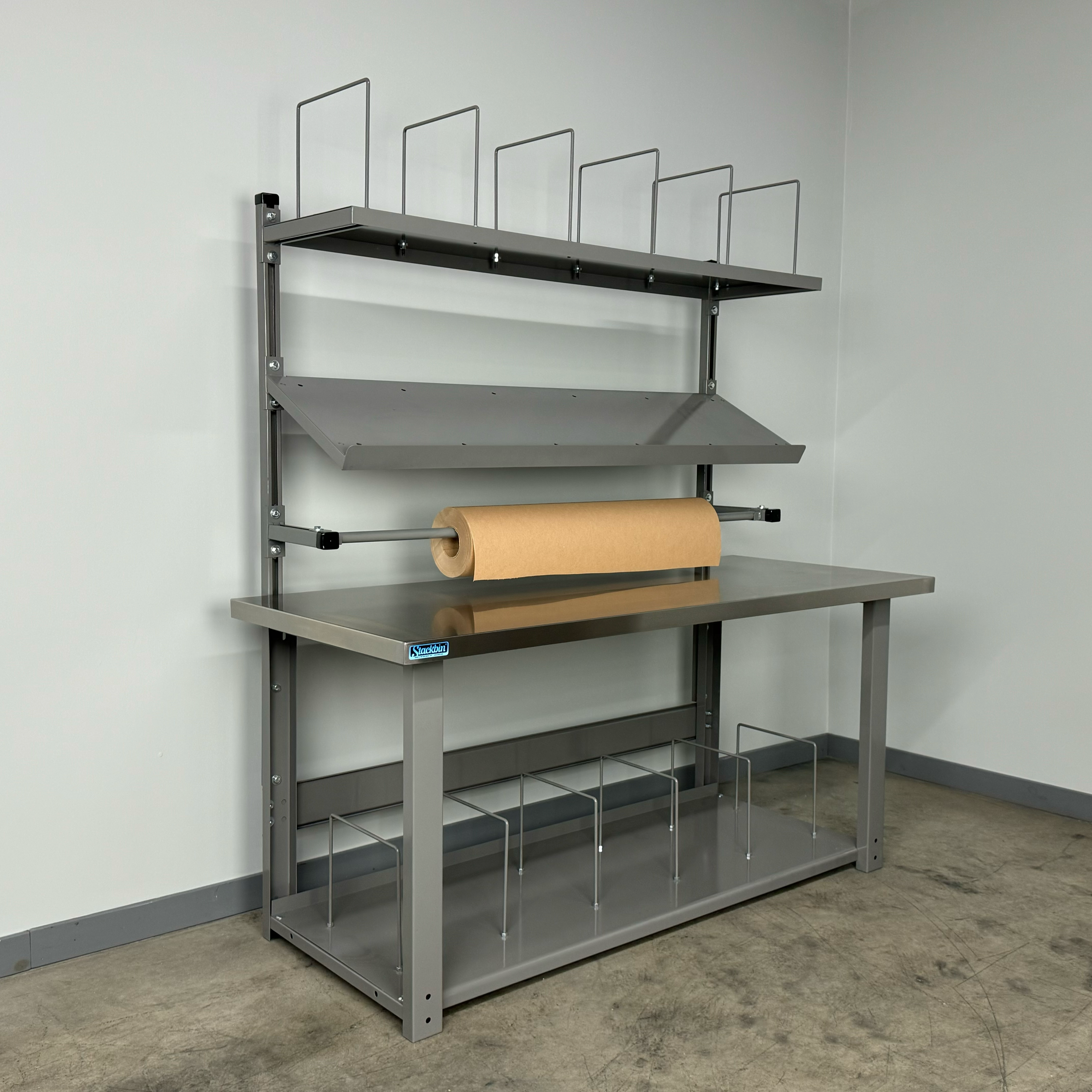 The full-depth bottom shelf provides generous storage space for boxes, bulk packing supplies, shipping labels, scales, and other essential materials. Its full-depth design maximizes storage capacity while keeping items organized and within easy reach.