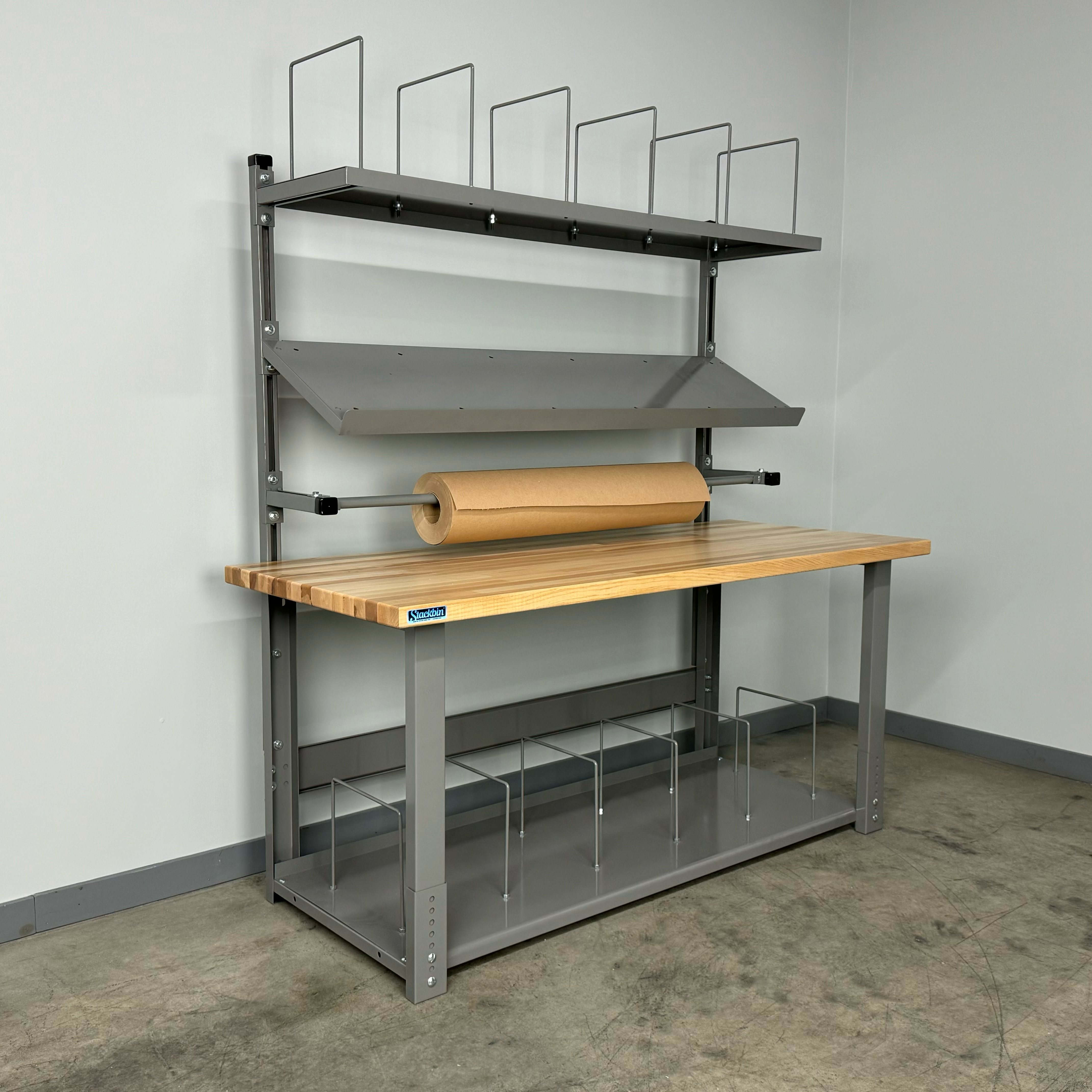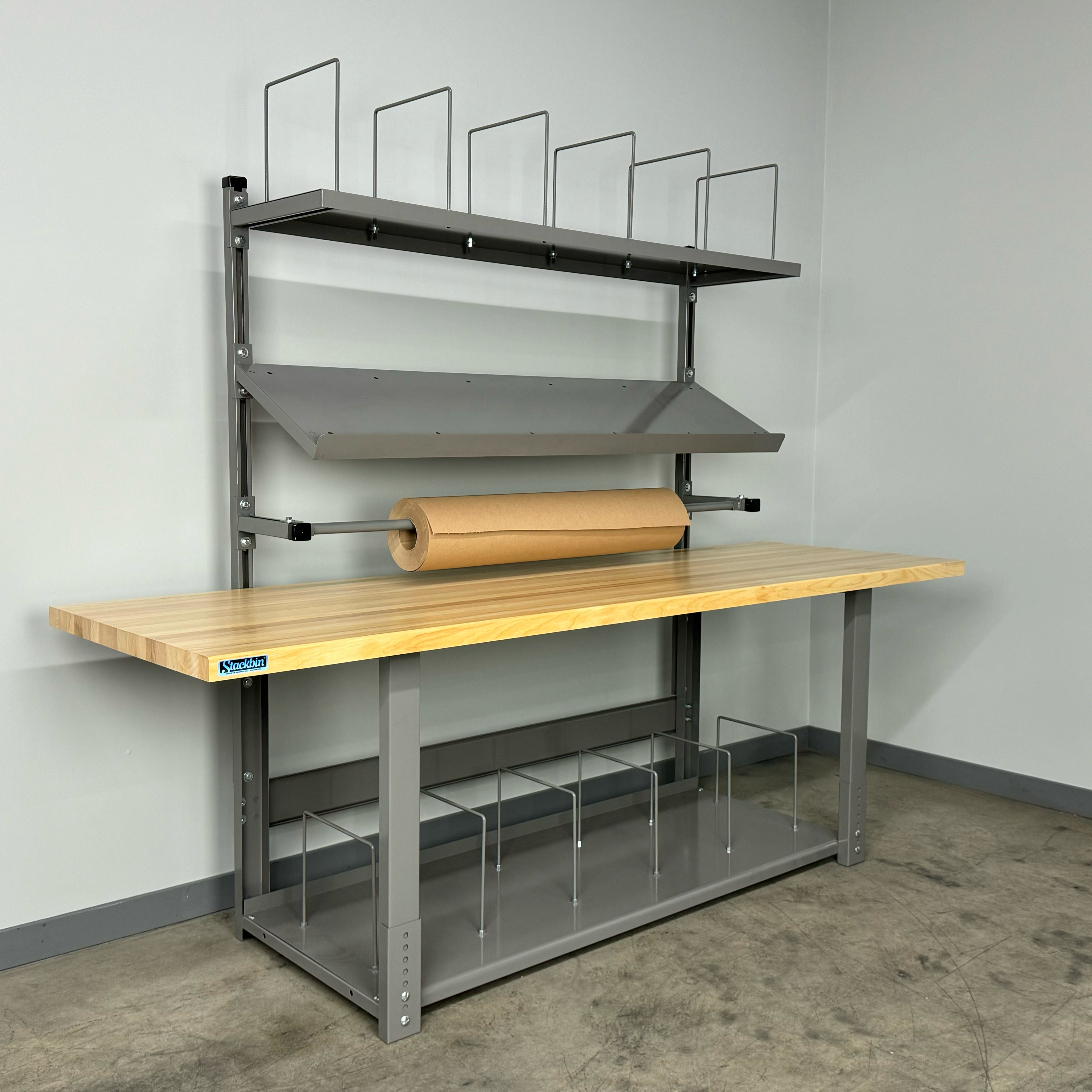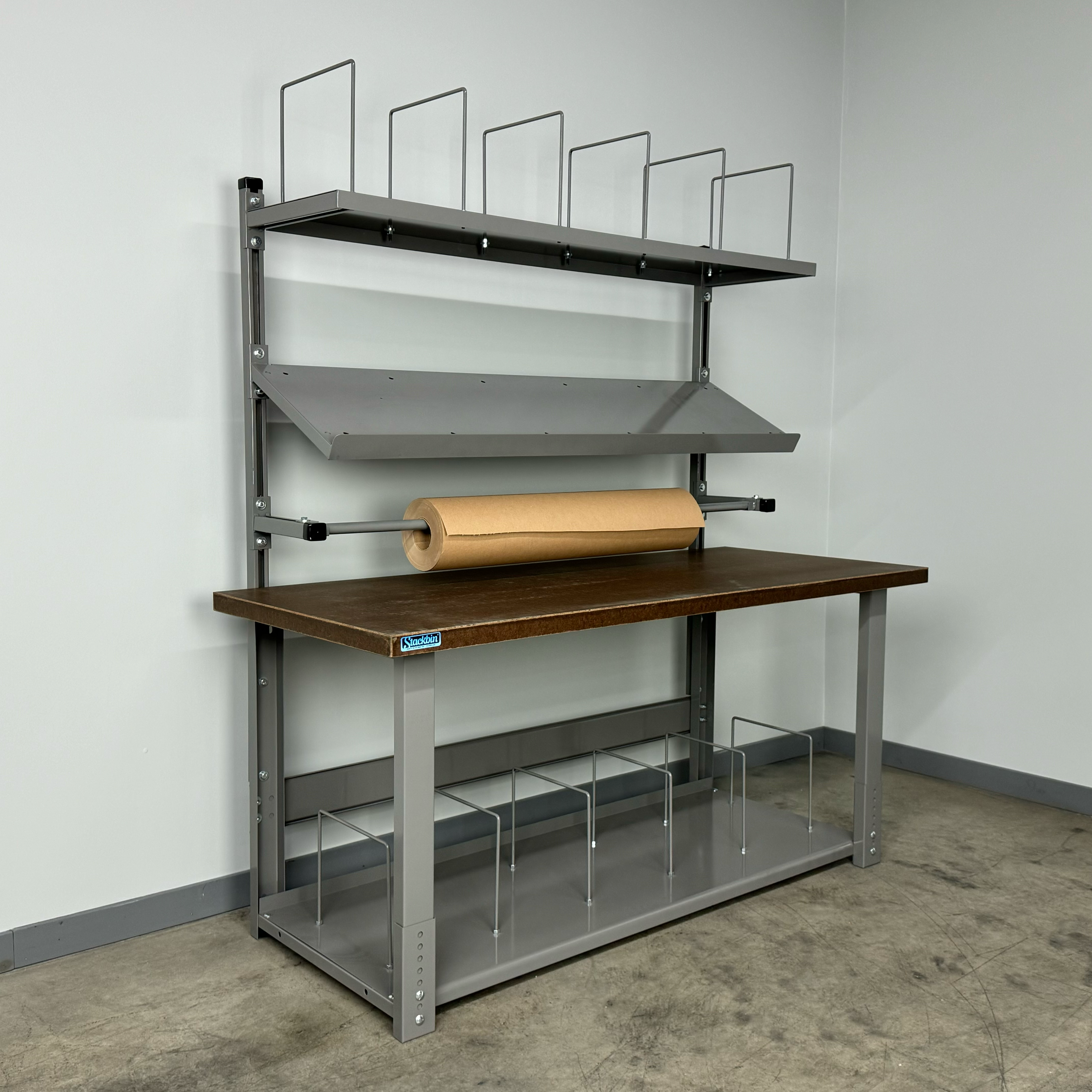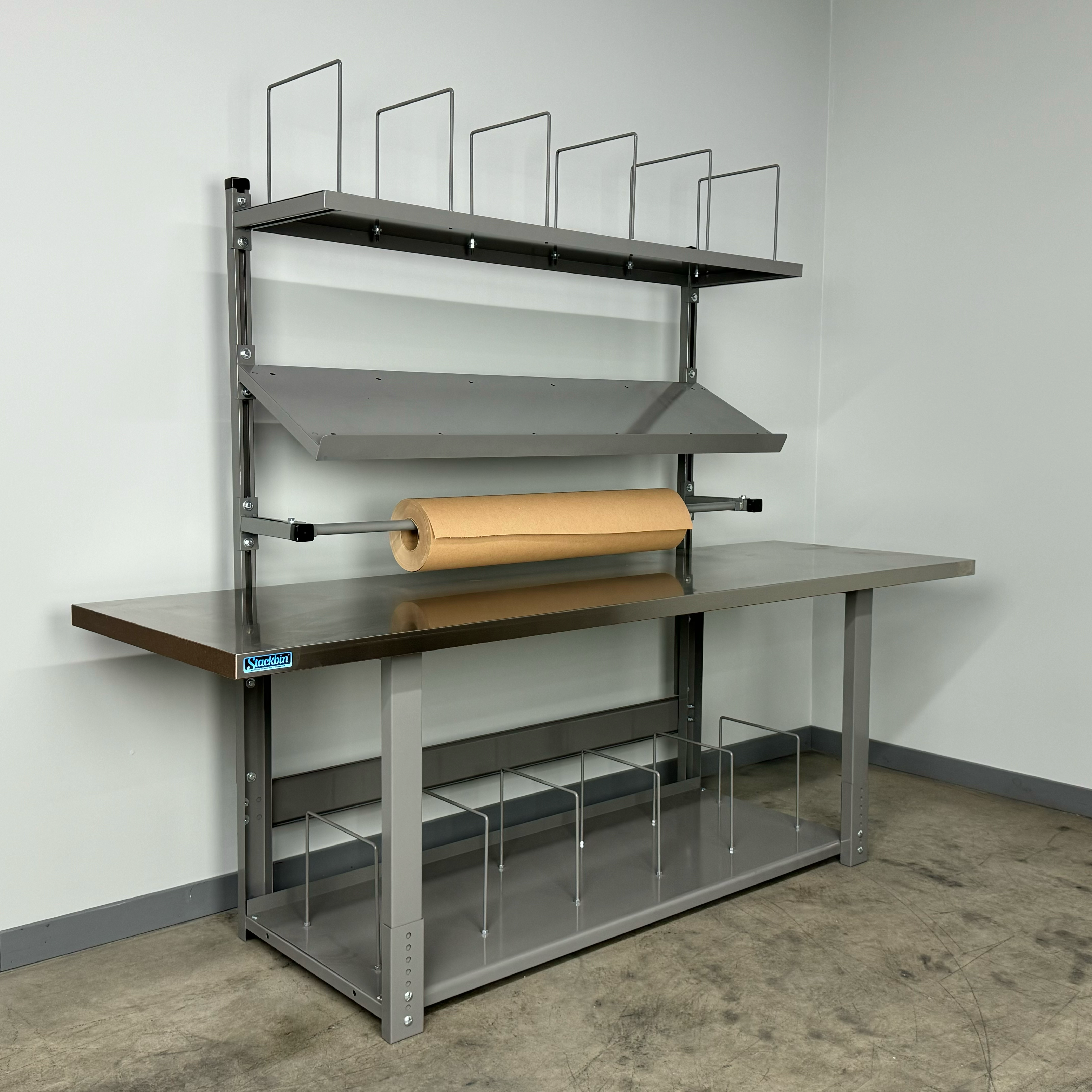 The full-depth bottom shelf provides generous storage space for boxes, bulk packing supplies, shipping labels, scales, and other essential materials. Its full-depth design maximizes storage capacity while keeping items organized and within easy reach.