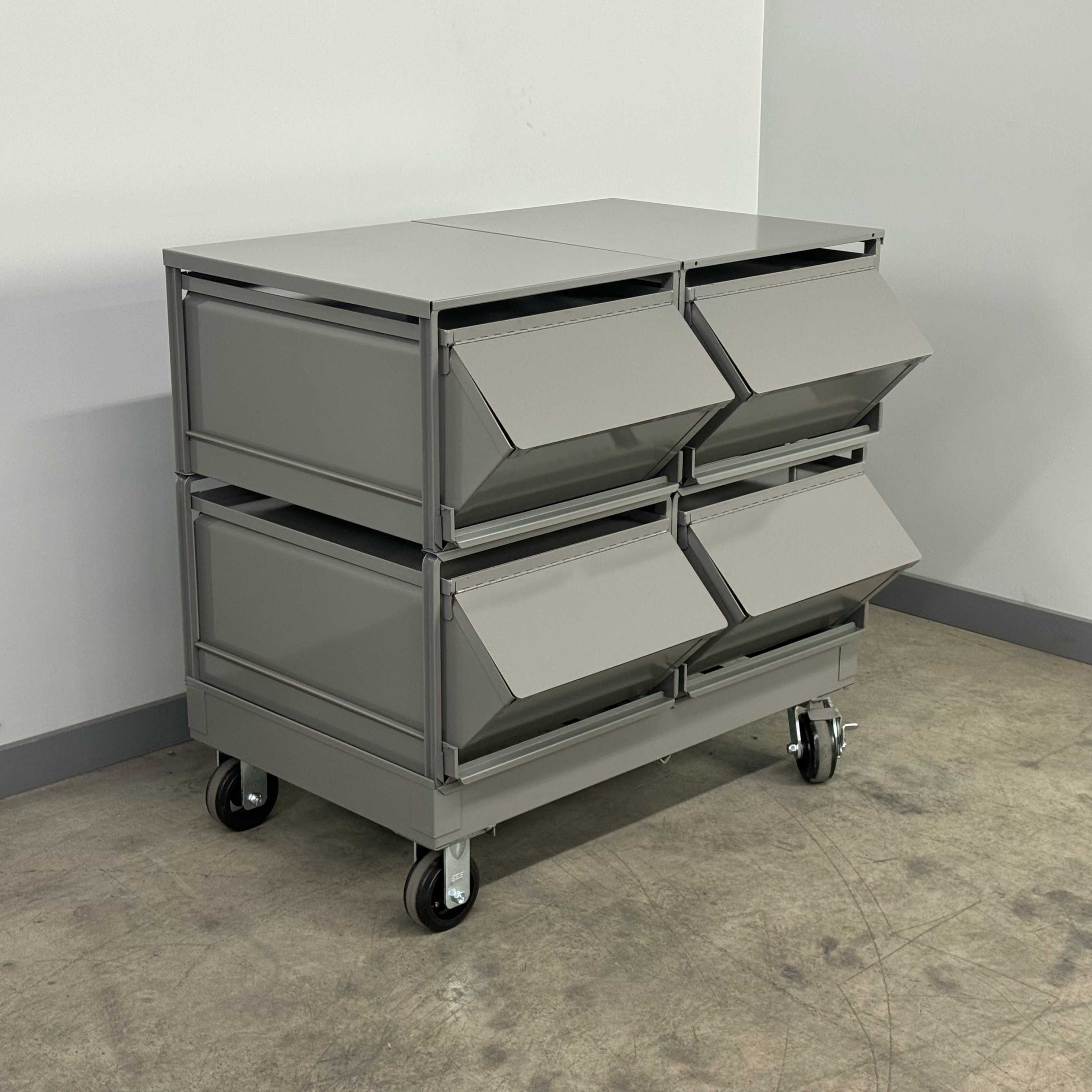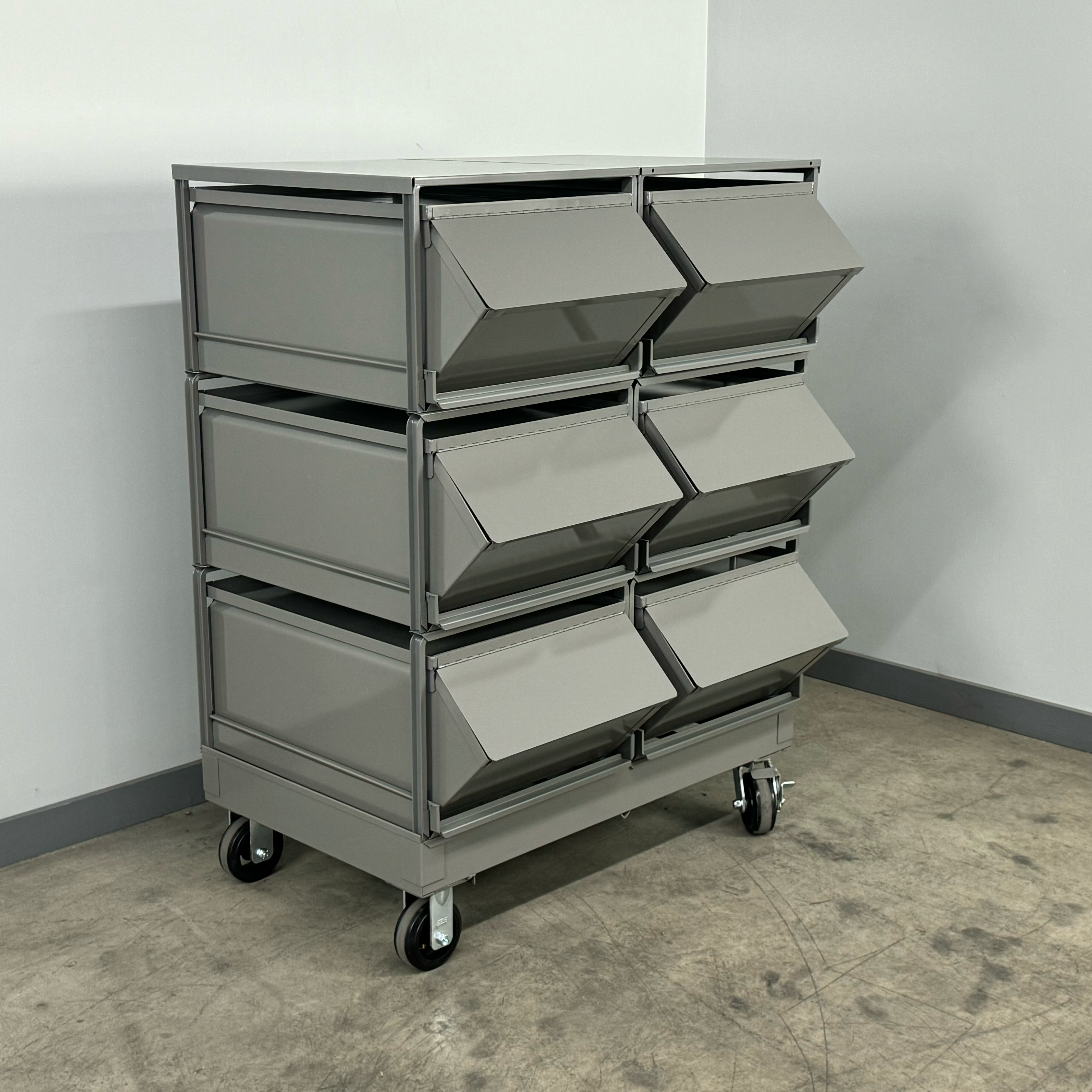 Each unit features same-size bins to maintain a clean, consistent layout—perfect for small parts storage bins, hardware, fasteners, and production components. The #6 Stackbin compartment size is 30″ L × 18″ W × 12″ H, giving you ample capacity for bulk items while keeping everything neatly organized. Choose the rugged steel bin look or pair with a stainless steel bin option in your workspace for added durability and cleanability.