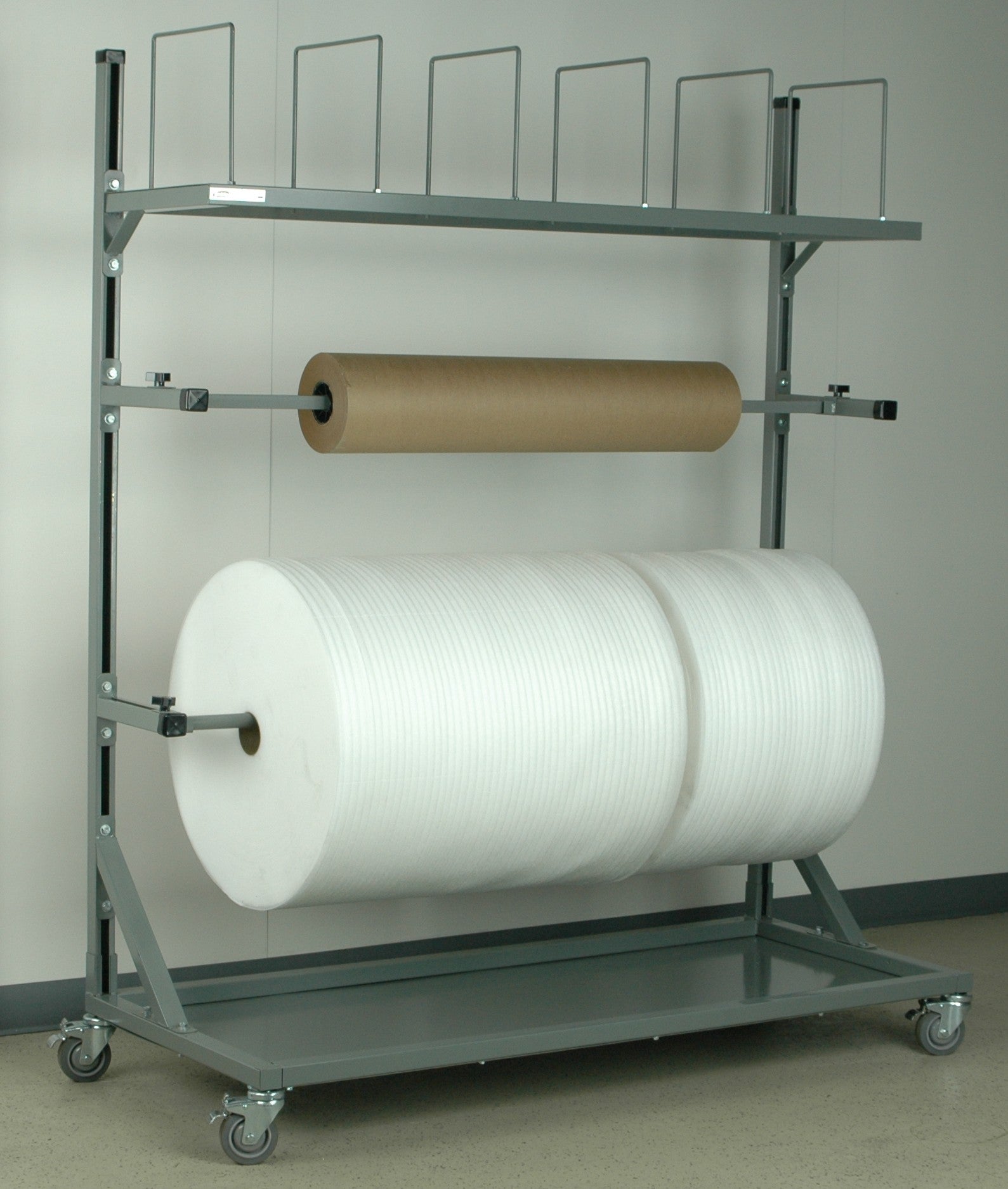 Engineered as the ultimate adjustable workbench, this mobile unit features dual spool holders that can be positioned exactly where you need them for optimal packing material access. The spacious 16-inch-deep upper carton shelf includes convenient dividers to keep your workspace organized, while the solid bottom shelf provides additional storage capacity for tools and supplies.