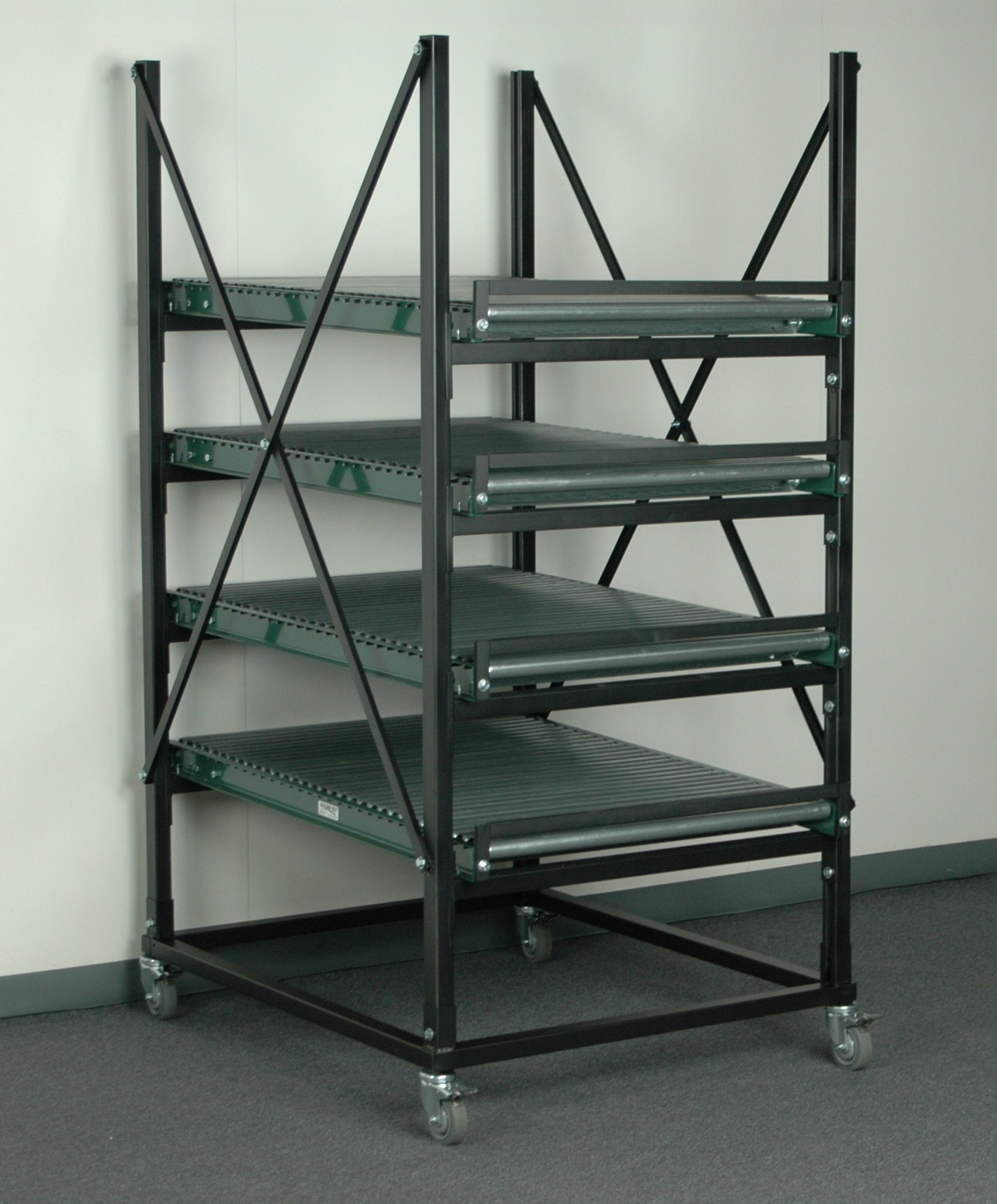 This mobile flow rack features four full levels of conveyor rollers, providing ample vertical storage space while keeping your heavy parts and inventory readily accessible and organized.