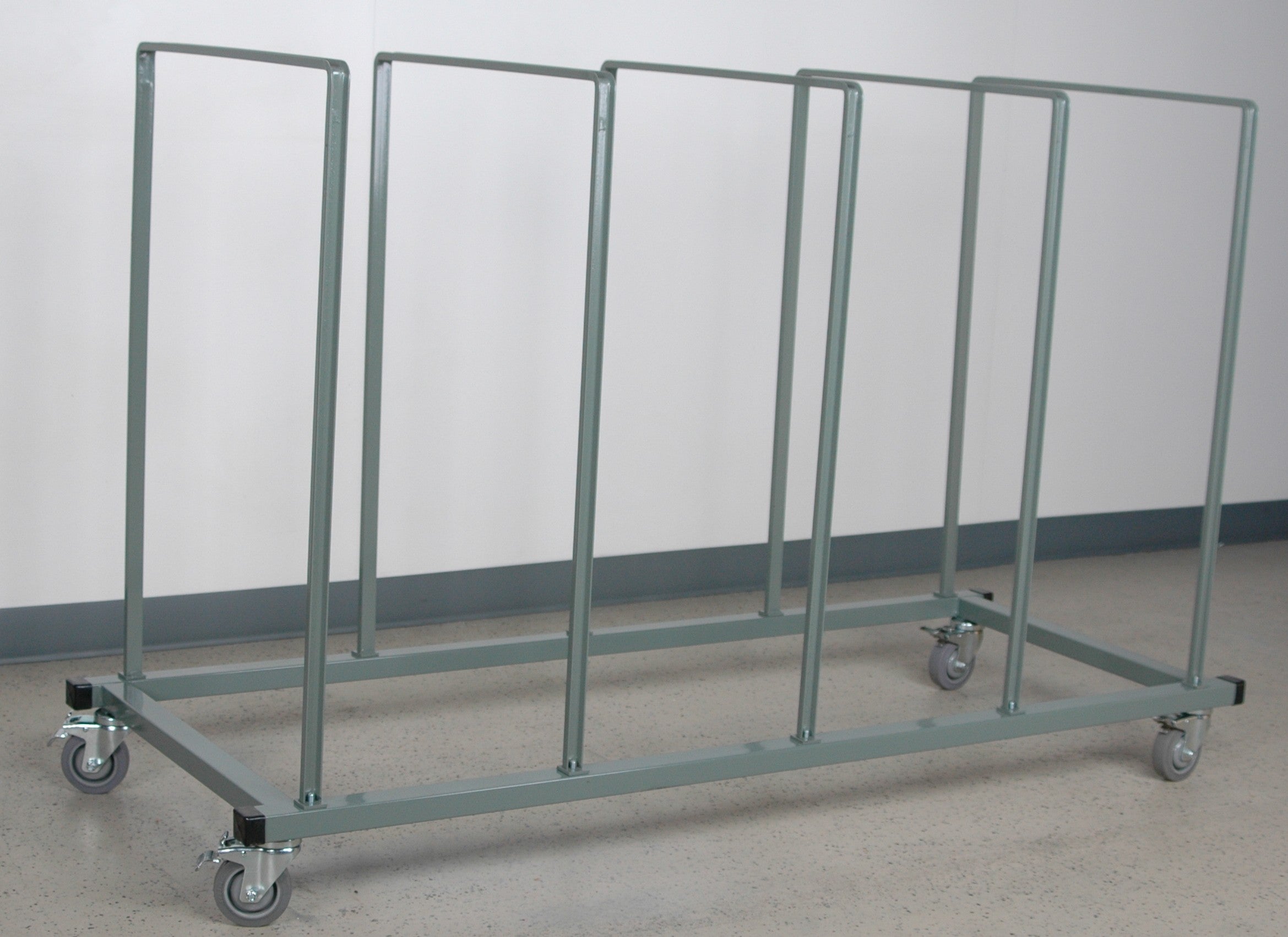 Perfect for use as a vertical sheet rack or general-purpose storage system, this mobile unit maximizes floor space efficiency. The largest model measures 52" L × 24" D × 42¾" H, providing ample storage capacity while maintaining a compact footprint that fits through standard doorways.