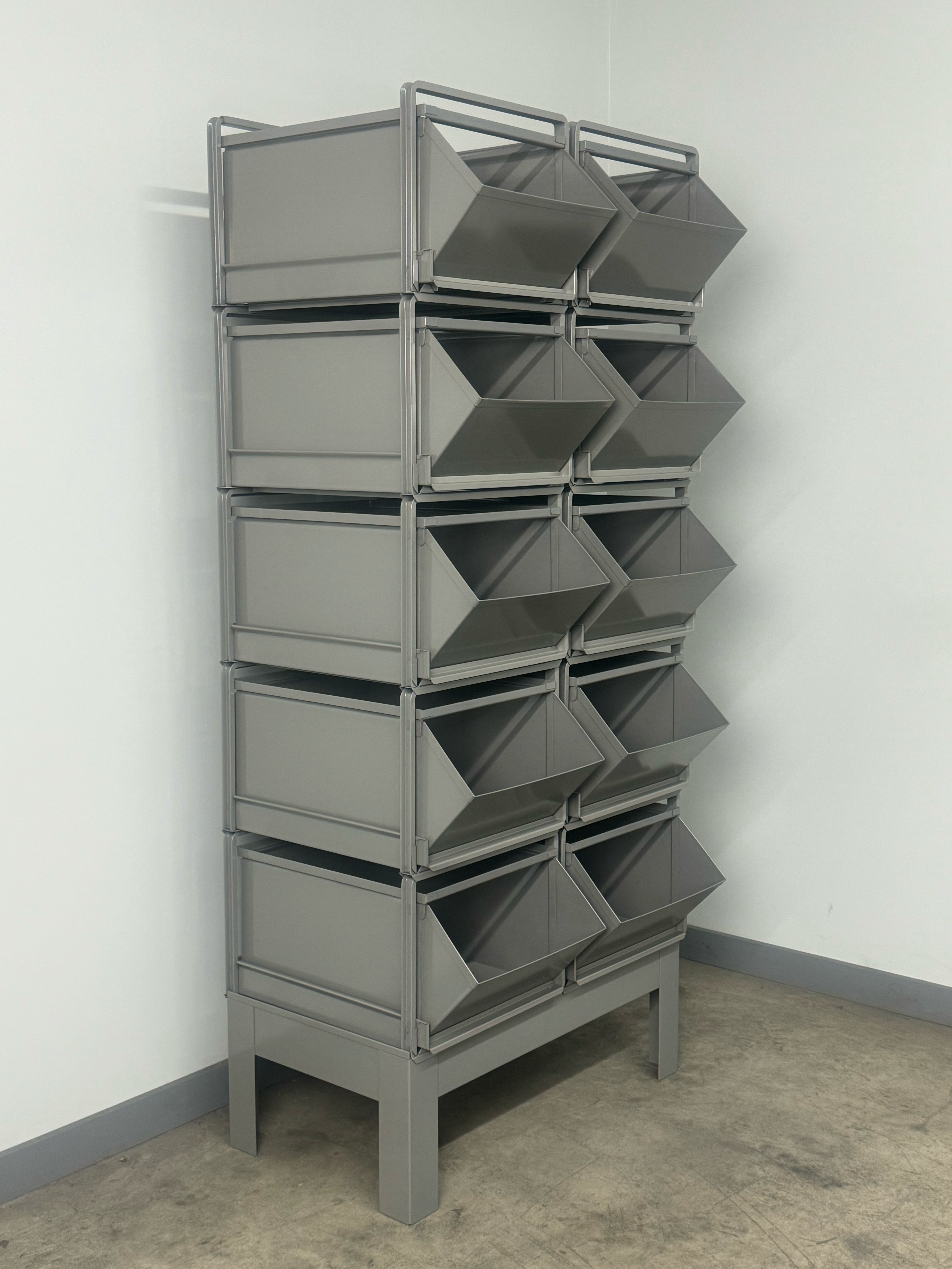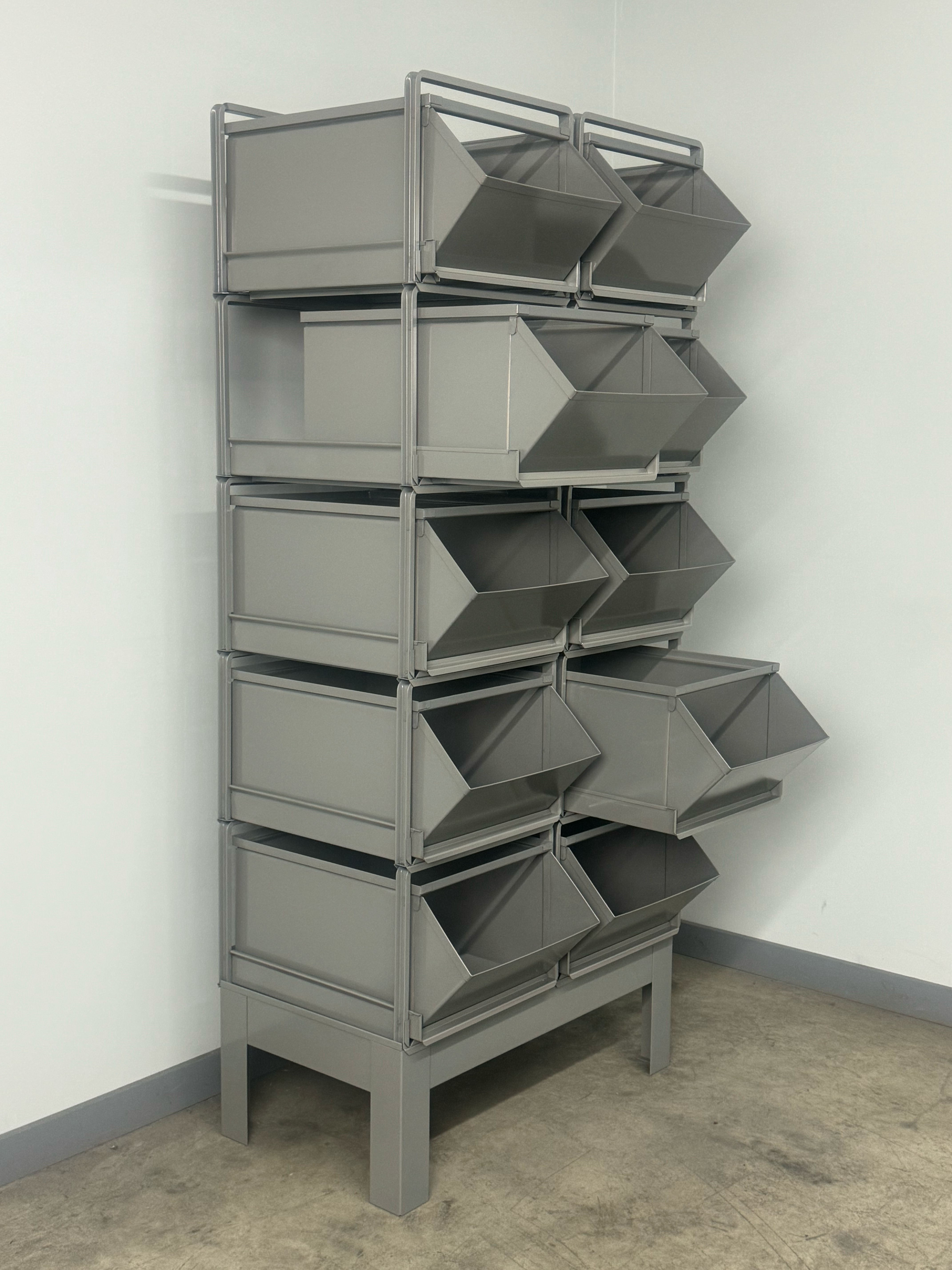 Streamline your workspace with a rugged, modular bin storage cabinet built on a #5 roller-bearing StackRack and Stackbin combo. This flexible system accepts metal stacking bins and stackable metal storage bins to keep parts organized, visible, and easy to access—ideal for production lines, maintenance rooms, and inventory areas.