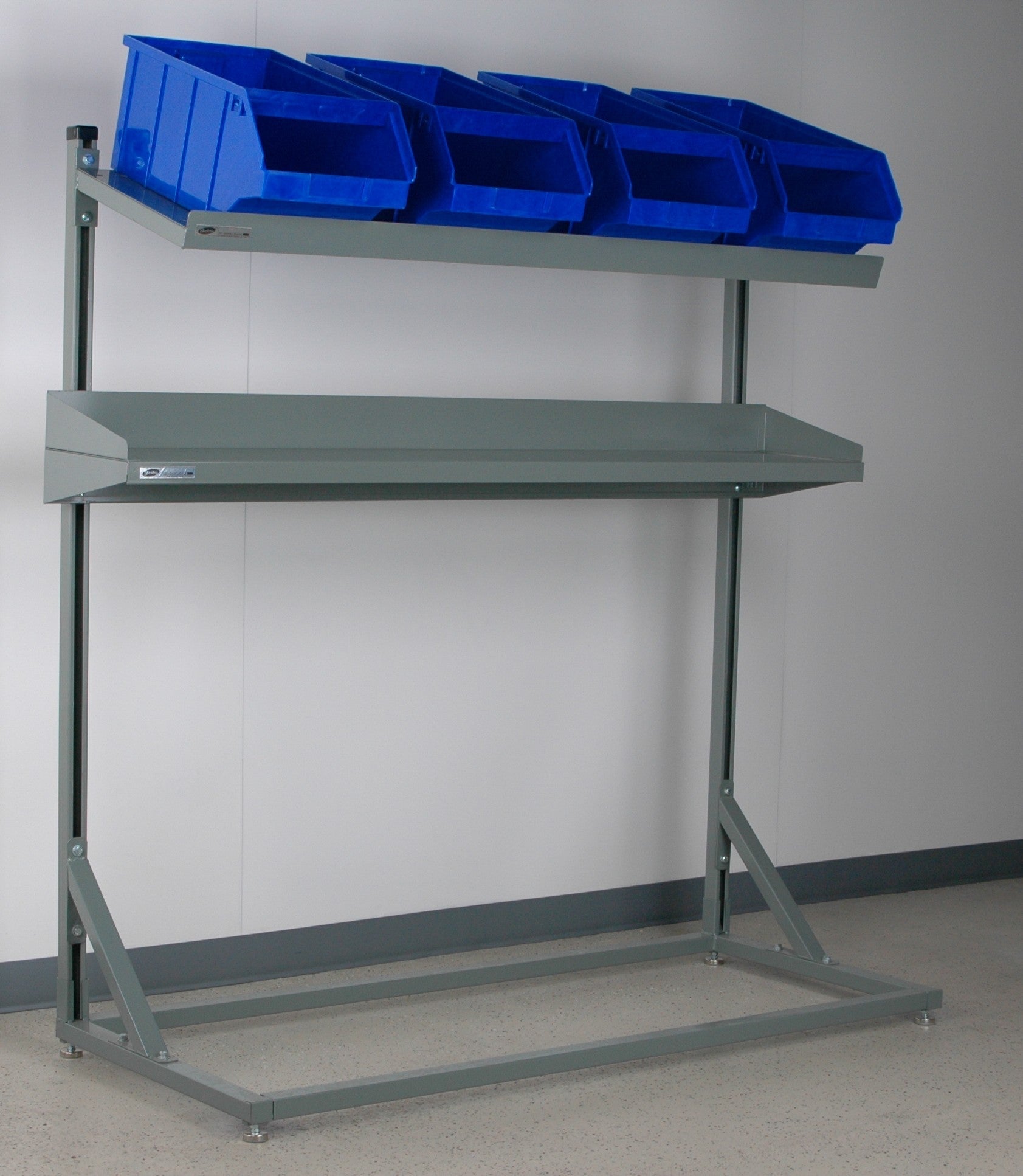 This fixed conveyor station includes the 16" deep top shelf with front lip along with the plastic bins shown. All the open front plastic Stackbins are heavy duty with a reinforced bottom for exceptional support. This style shelf with bins works great for the storage and easy viewing of items stored inside. There is a 12" deep shelf with rear and side lips that are ideal for the storage of other items necessary for the particular application. All shelving is able to adjust in height on the support uprights and all other accessories we offer are compatible on this conveyor workstation. Note that it does not come with the plastic bins.