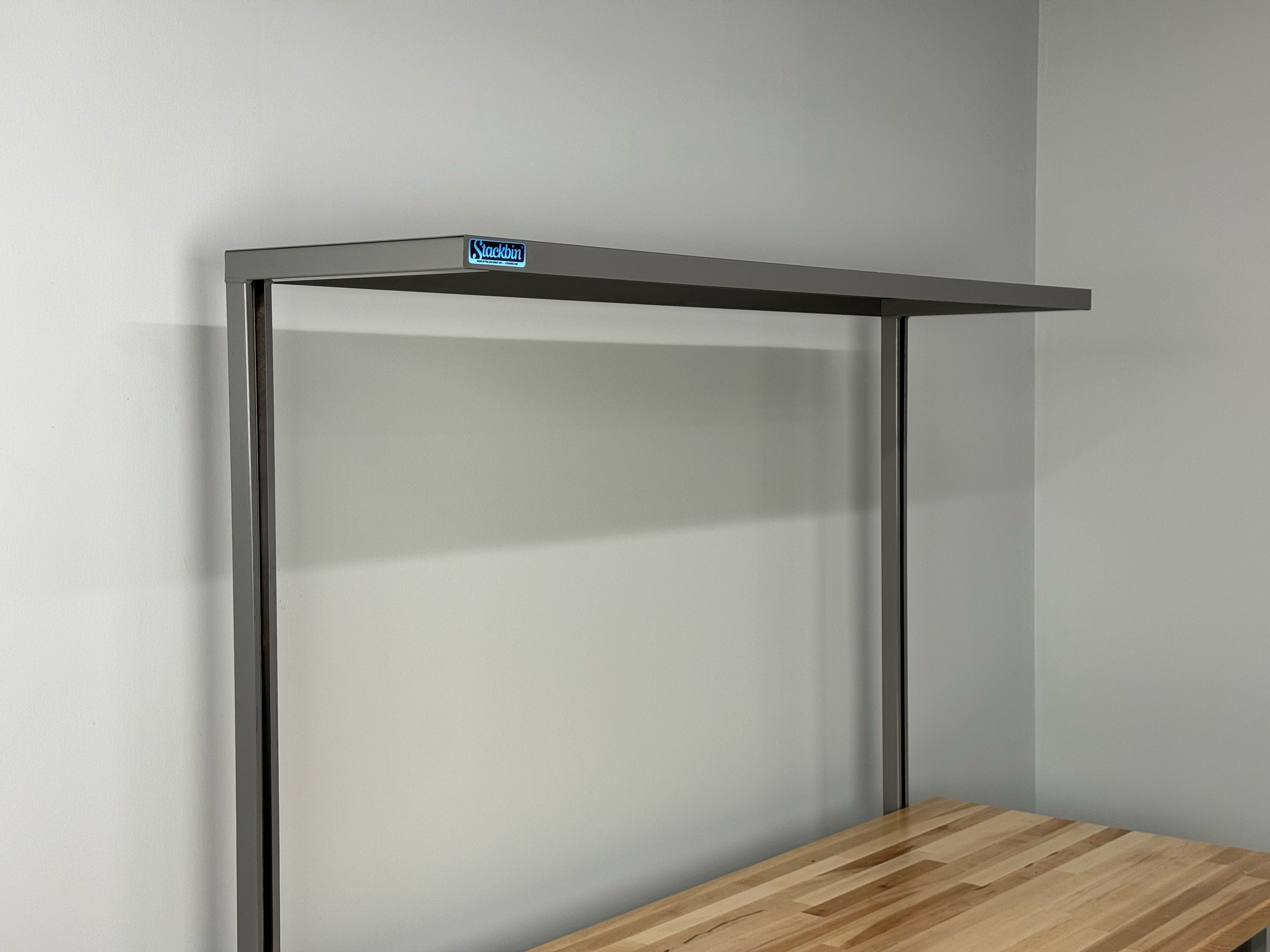 Enhance your Stackbin workbench with this overhead structure featuring a fixed 16″-deep top shelf that doubles as a light hood for Stackbin’s optional fluorescent fixture. Designed as an accessory for Stackbin industrial workbench setups, it mounts to compatible benches to improve visibility and organization without adding bulk. (Light fixture not included.)