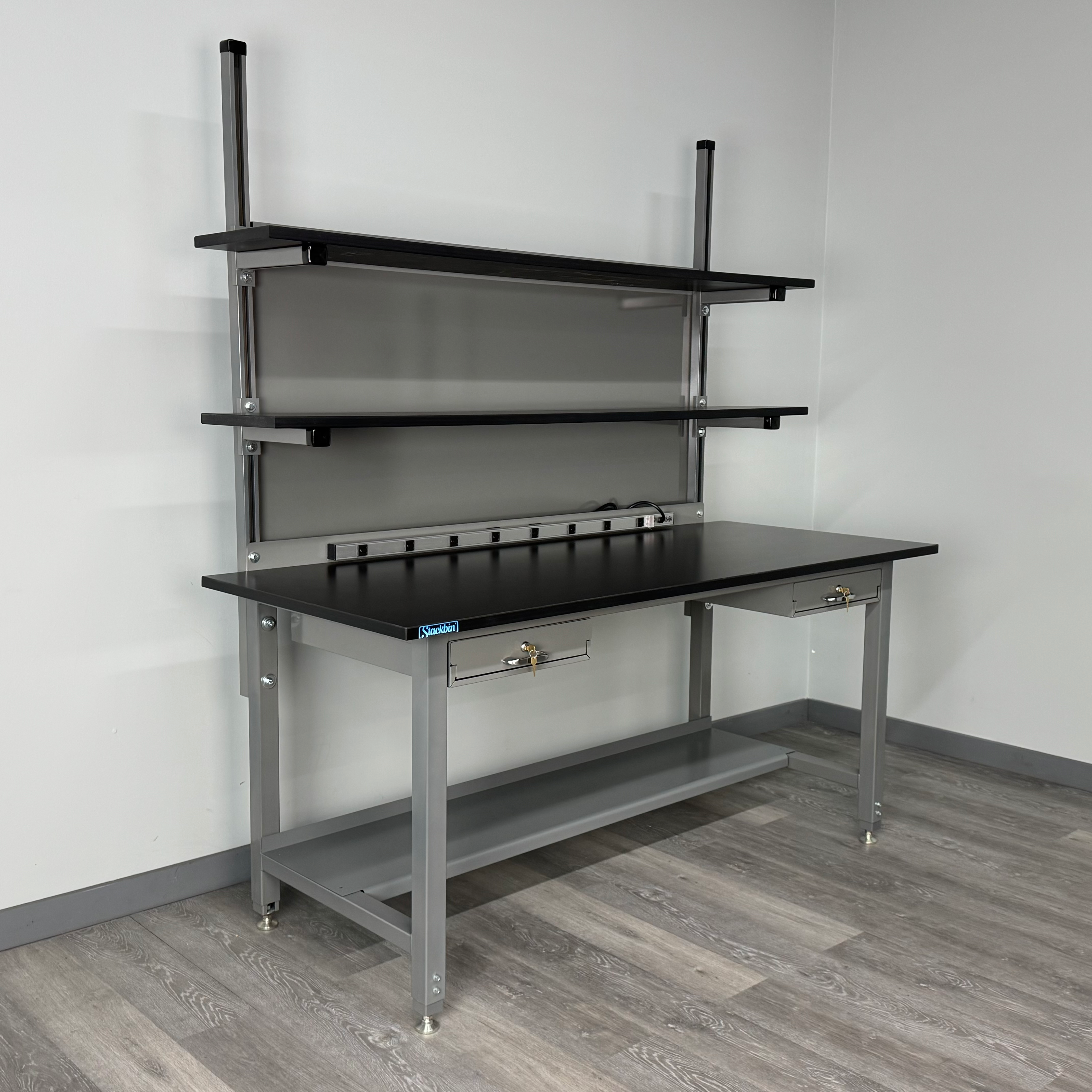 Optimize your workflow with integrated power and smart storage. The bench includes a mounted 8-outlet electrical strip for convenient power management, a rear vanity panel to keep wiring and utilities concealed, and upper phenolic shelves that provide additional storage without cluttering your working area. A half-depth bottom shelf increases capacity while preserving leg space for comfort during extended tasks.