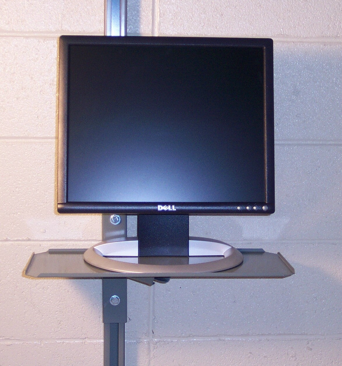 The monitor tray is a simple 18 gauge formed tray that is welded to a bolt plate. This small tray will mount to table with an overhead structure uprights to support a flat screen monitor or other related sized item. All trays will adjust up and down on the workbench overhead uprights.