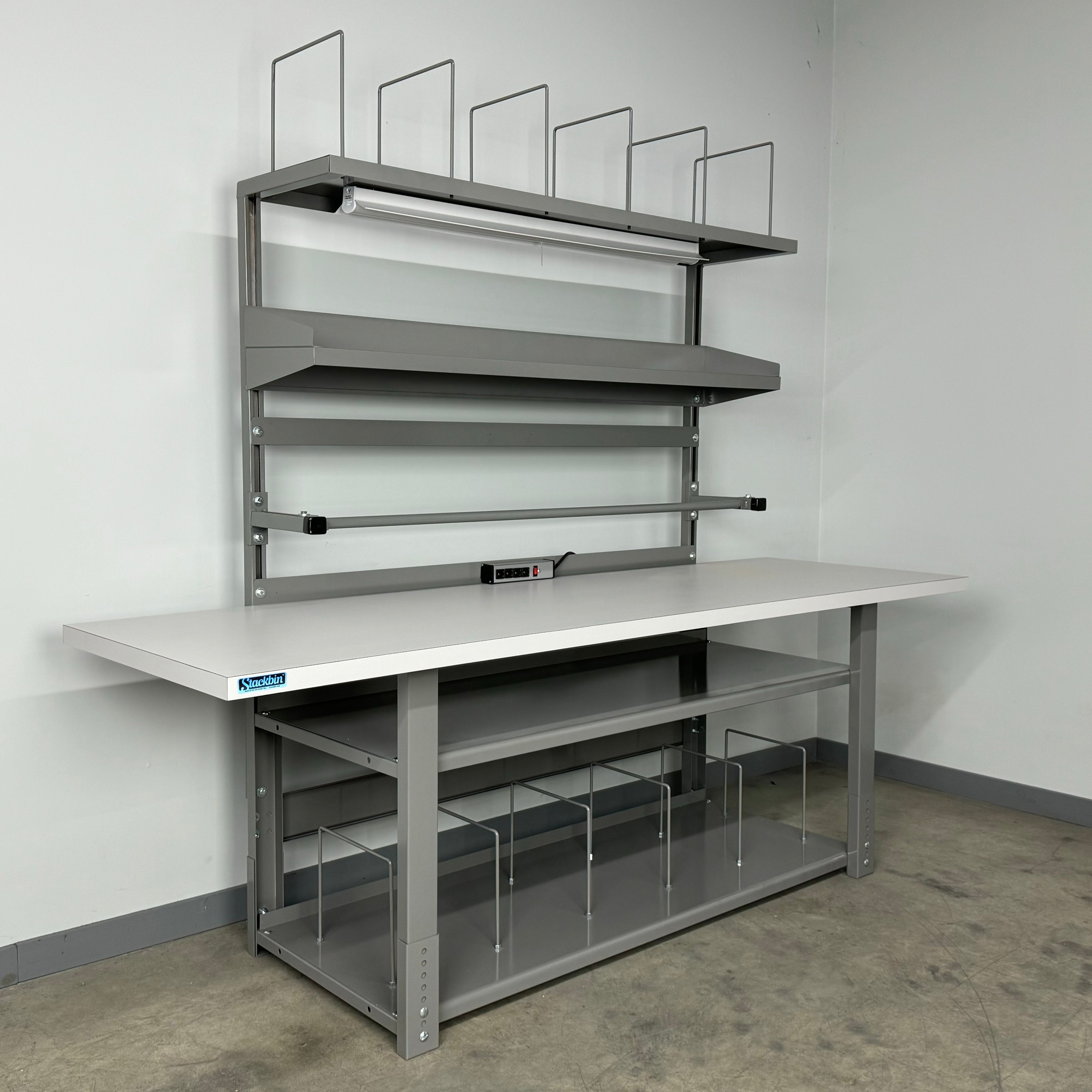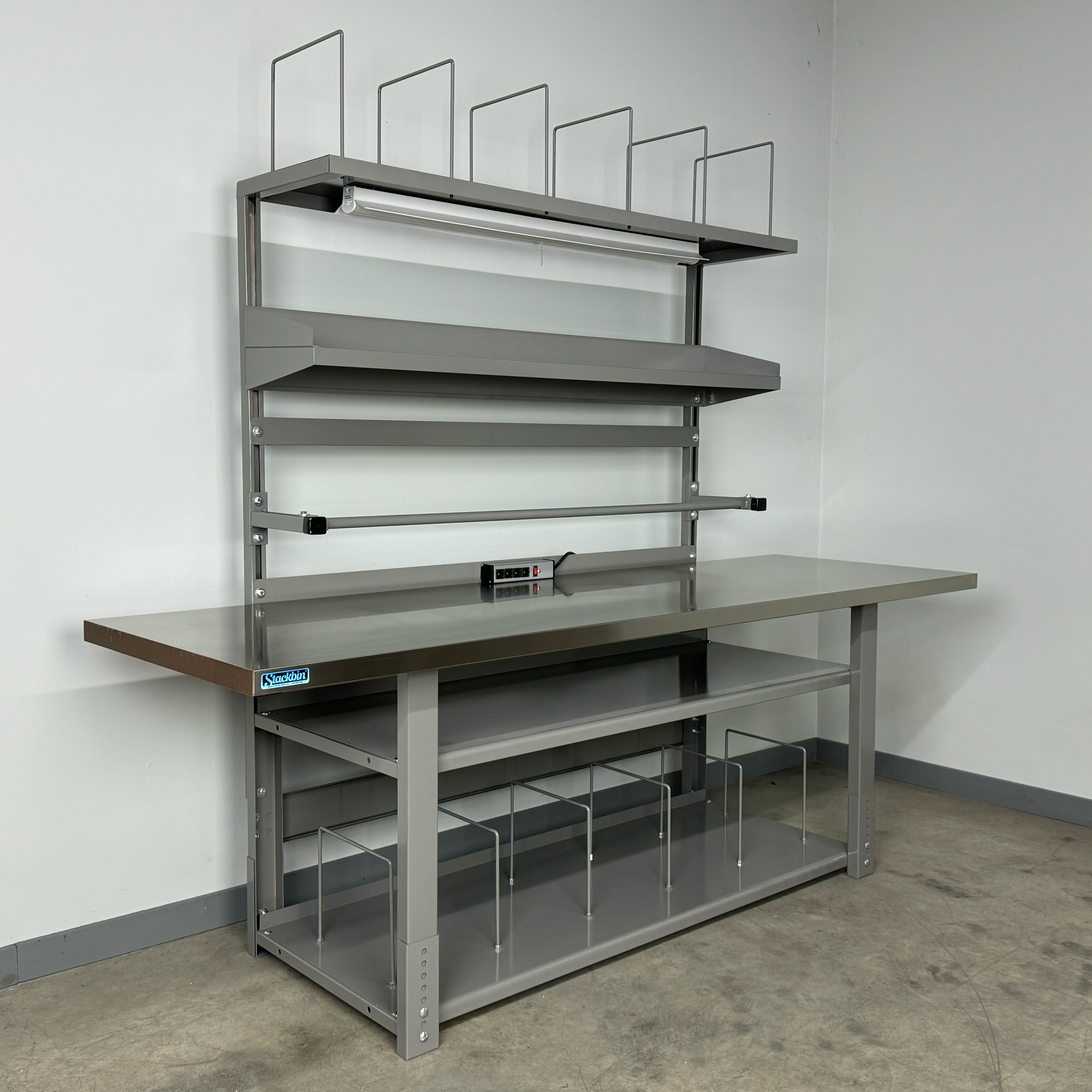 This heavy duty workbench is engineered for maximum efficiency in shipping and packaging operations. Built with durability in mind, this custom workbench features a straight overhead structure with a fixed top shelf for convenient carton storage and two full-depth bottom shelves that provide exceptional organization capabilities.