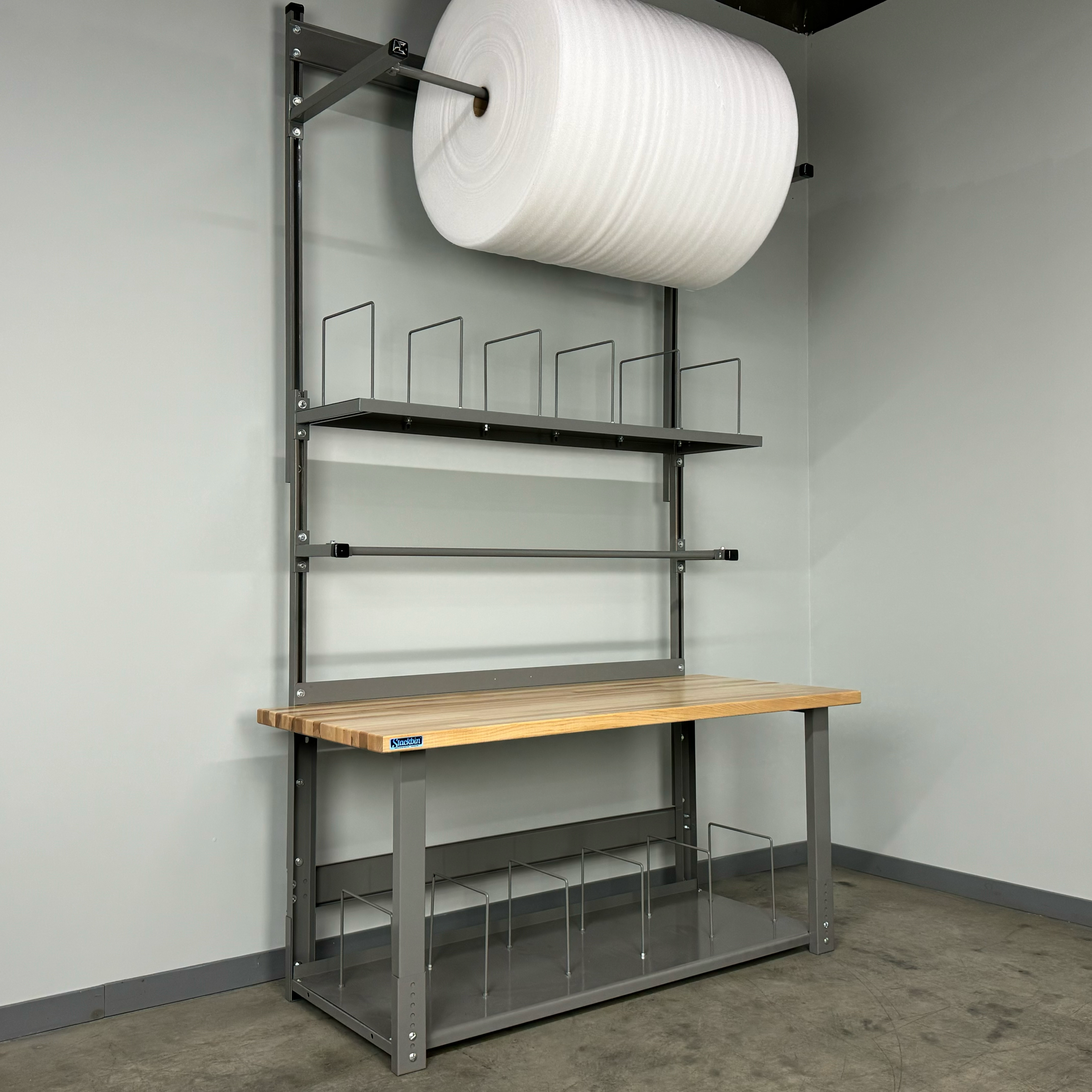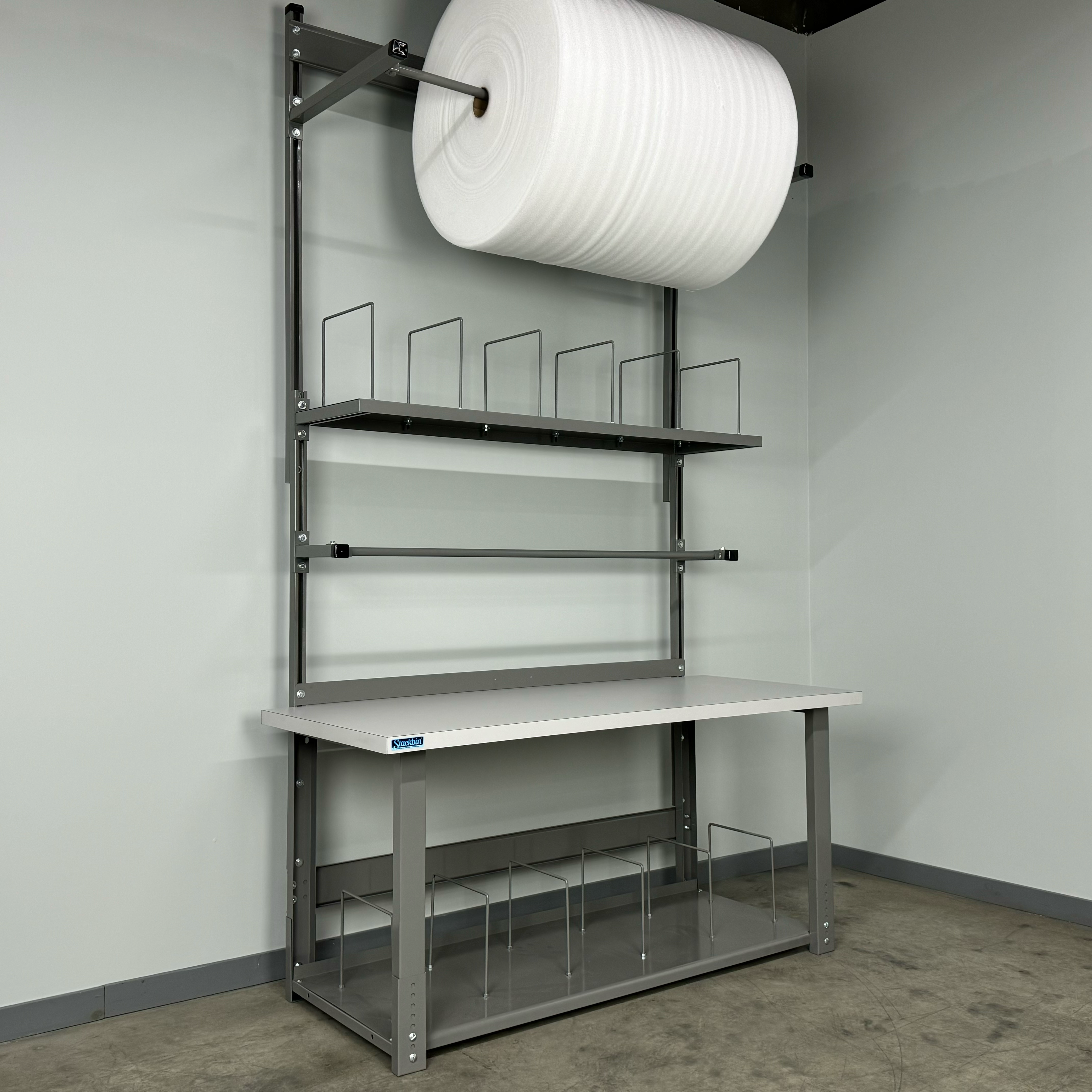 Built to perform in production floors, warehouses, and busy mailrooms, this durable workbench enhances organization and productivity without sacrificing comfort. The four-way adjustable spool holder lets you dial in the perfect setup for different packaging media, and the overhead layout keeps surfaces clear and workflows smooth. Choose this custom work bench style to optimize your operation—ideal for businesses seeking a heavy duty adjustable height workbench alternative with integrated lighting and storage. It’s equally at home as a garage workbench or portable workbench solution in multi-use spaces where a reliable folding workbench isn’t required.