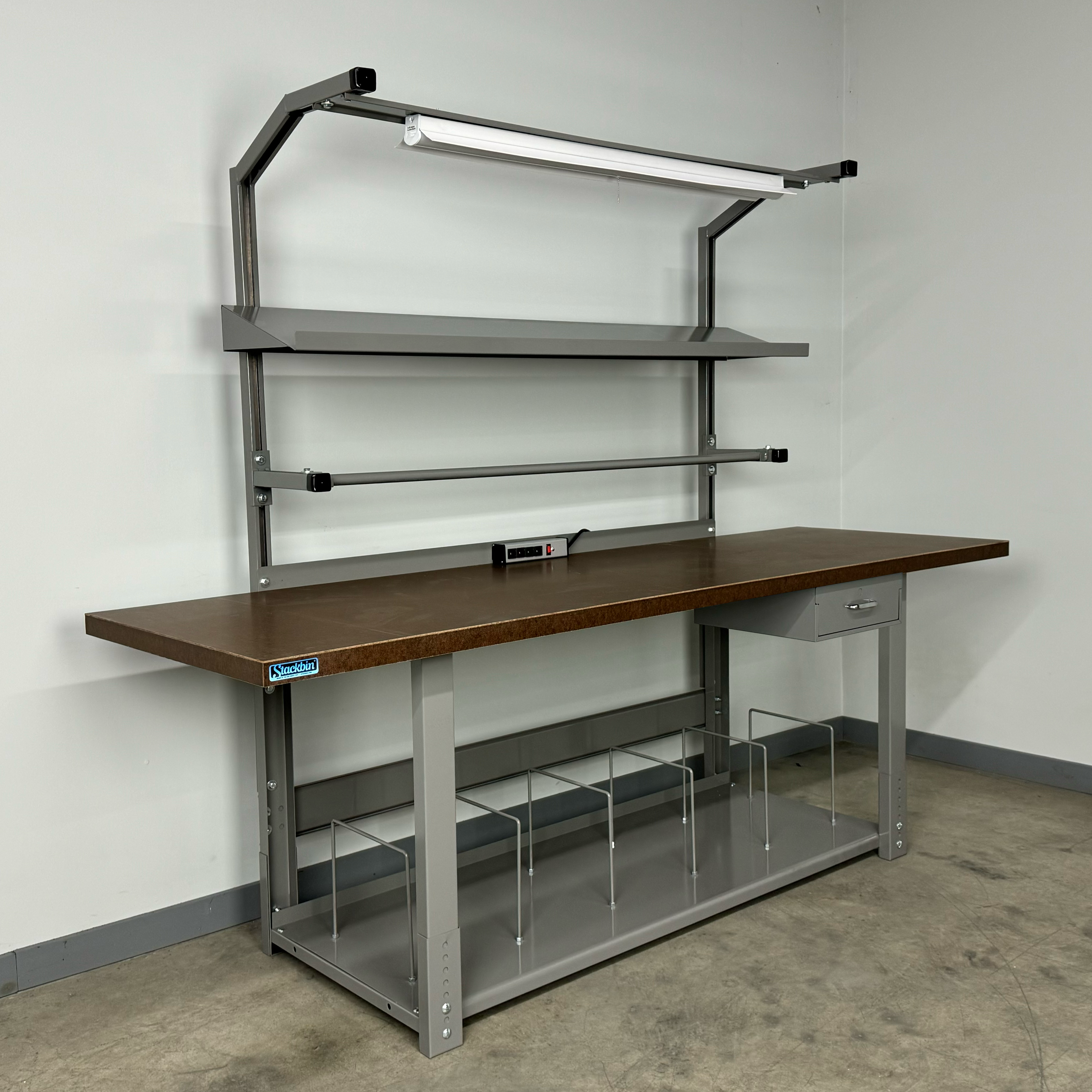 Streamline your shipping and packing operations with the durable, USA-made Packing Workbench #2. Engineered for professional efficiency, this industrial workbench features an angled overhead structure with integrated light support to enhance visibility and keep essential supplies within easy reach. A full-depth bottom shelf provides generous storage for cartons, tools, and materials, while a compact drawer adds secure space for frequently used items.