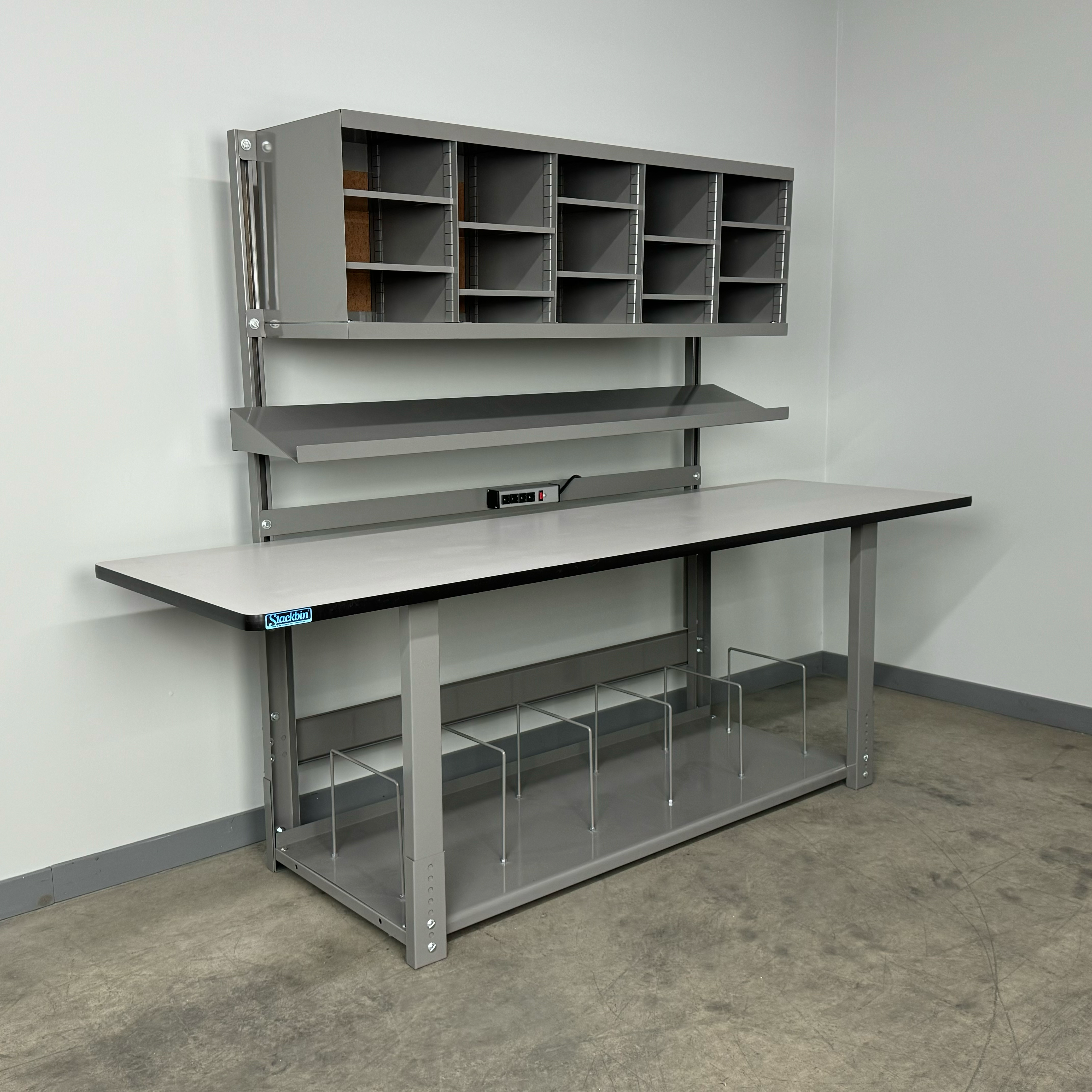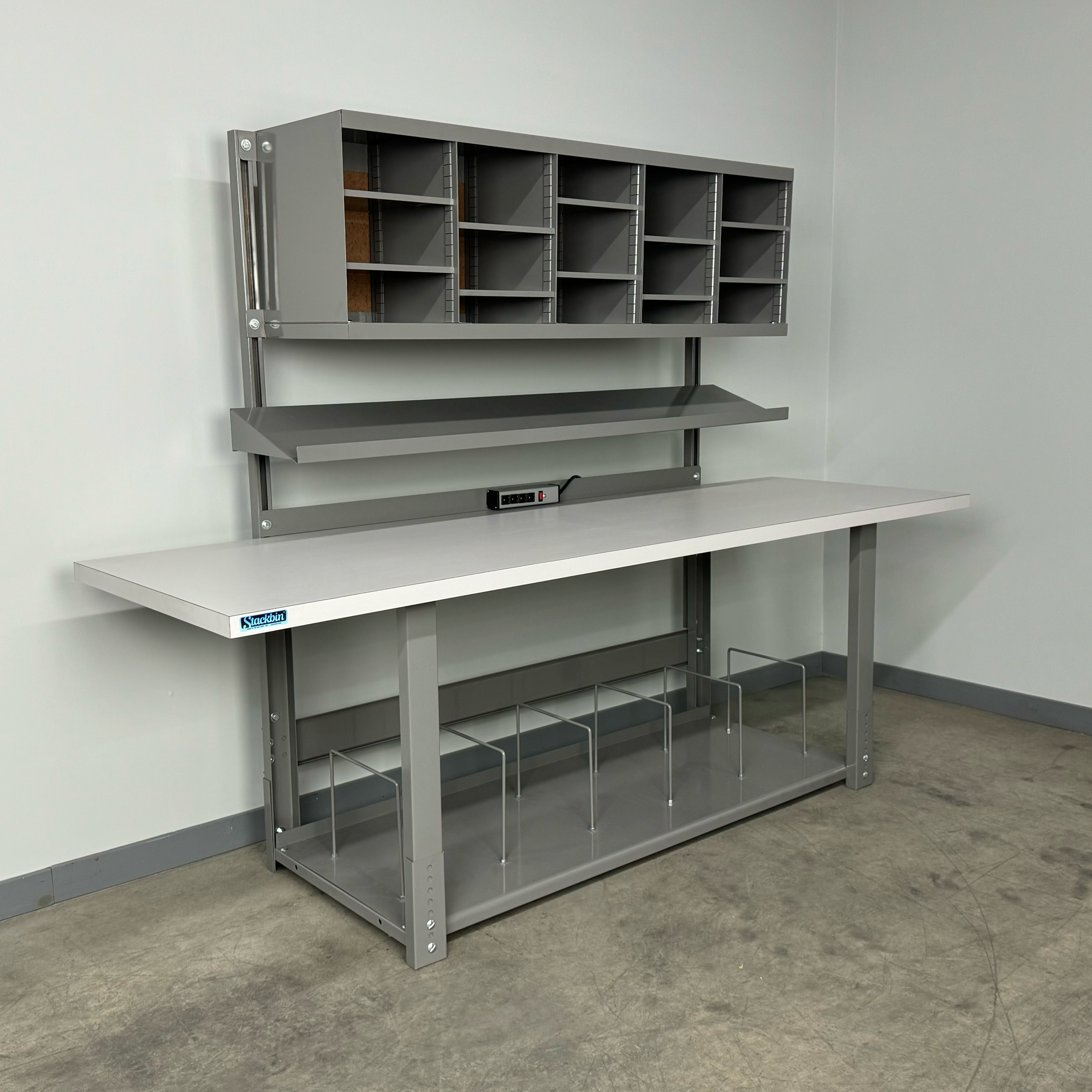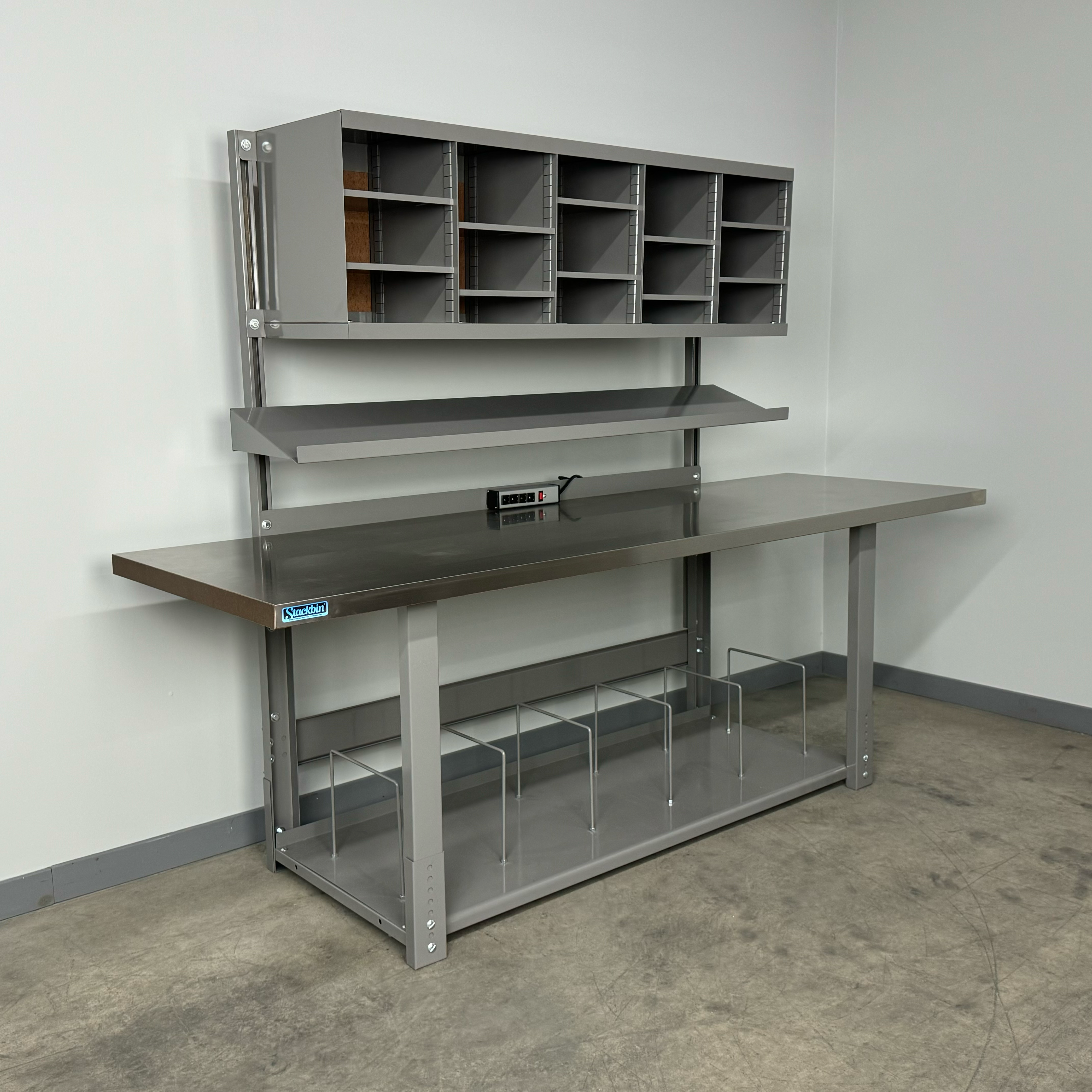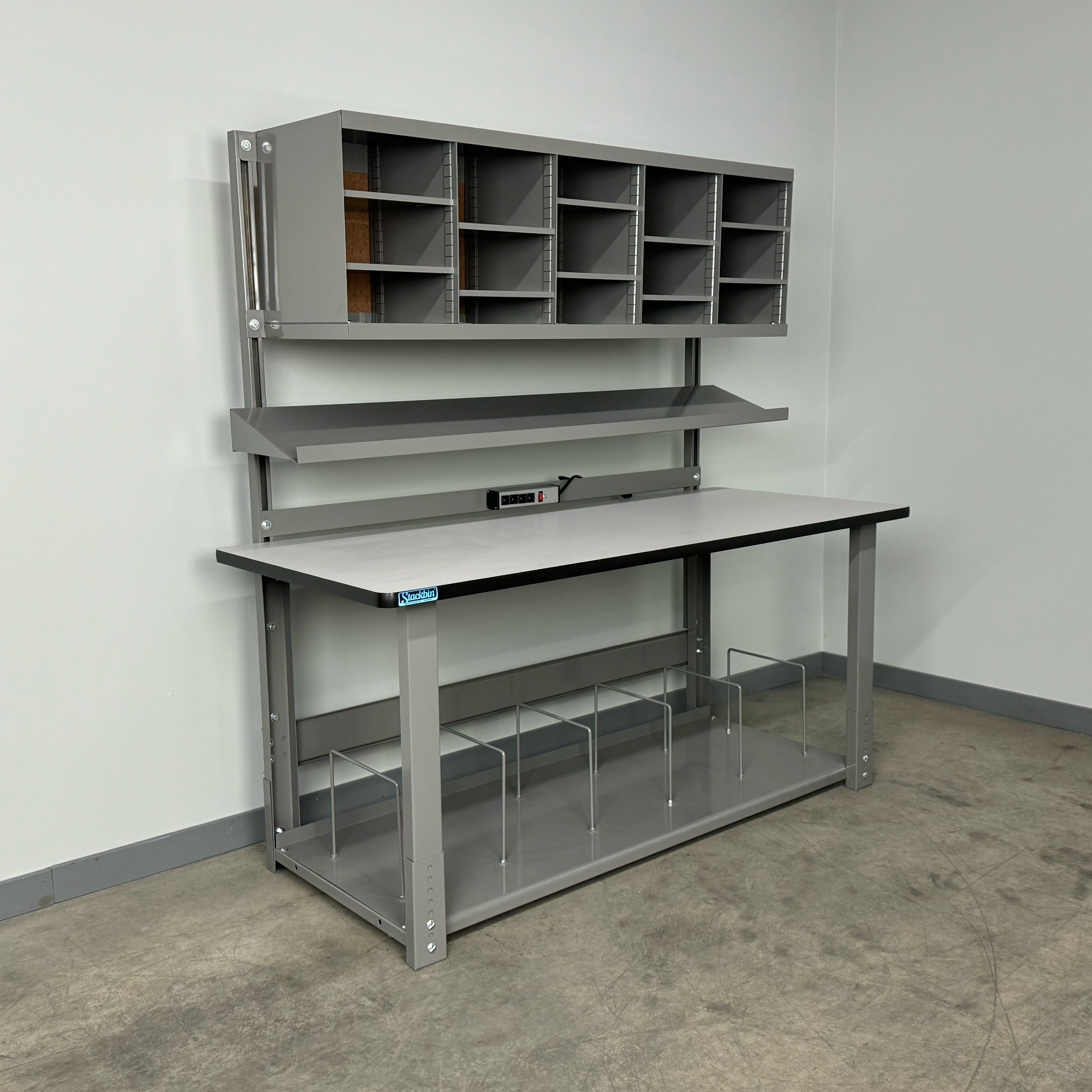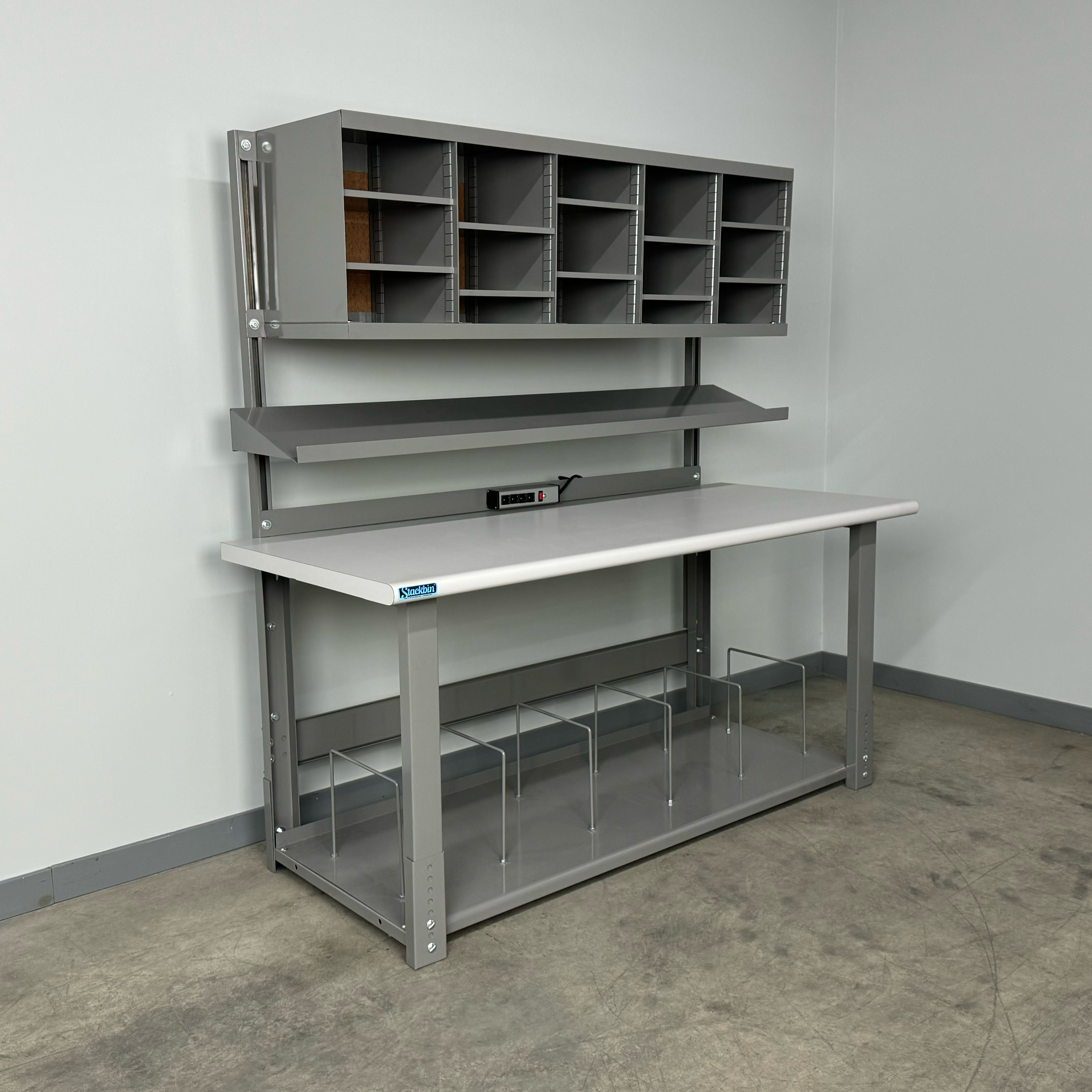 Boost productivity and keep supplies organized with this durable industrial workbench designed specifically for busy shipping stations. The straight overhead structure provides a clean, unobstructed workspace, while the integrated overhead sorter unit keeps labels, forms, and packaging materials within easy reach. A full-depth bottom shelf adds generous storage capacity for cartons, void fill, and essential tools, helping your team pack faster and smarter.