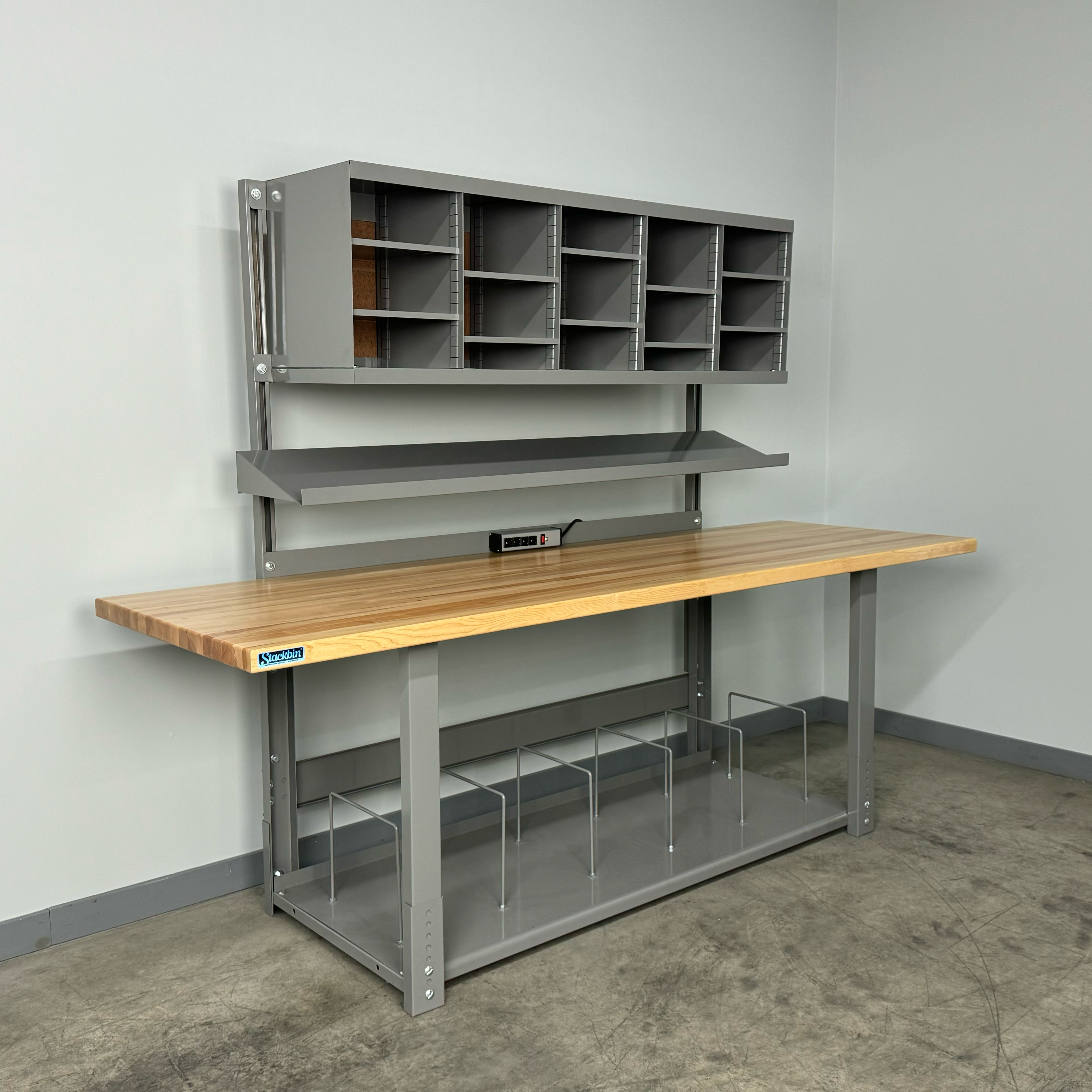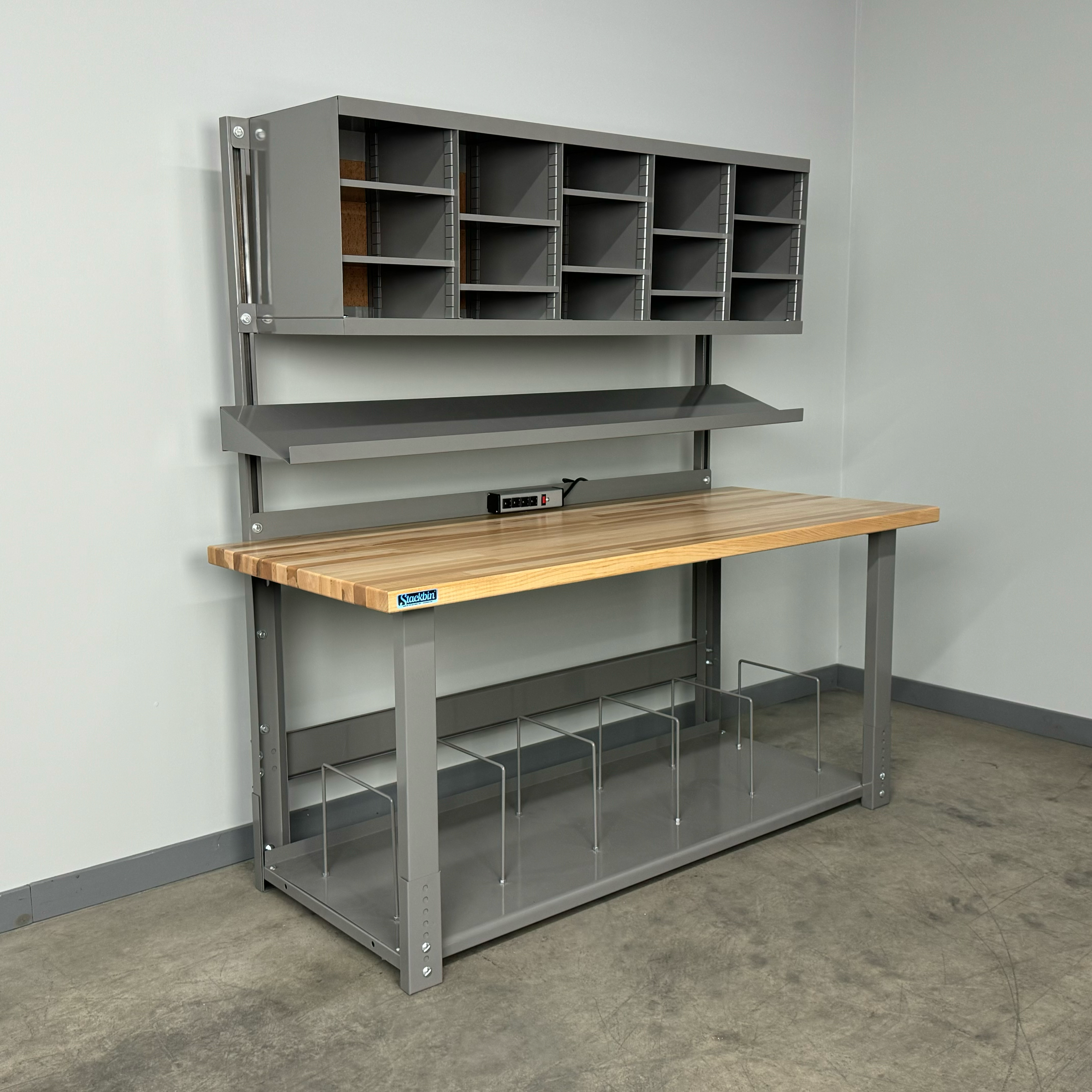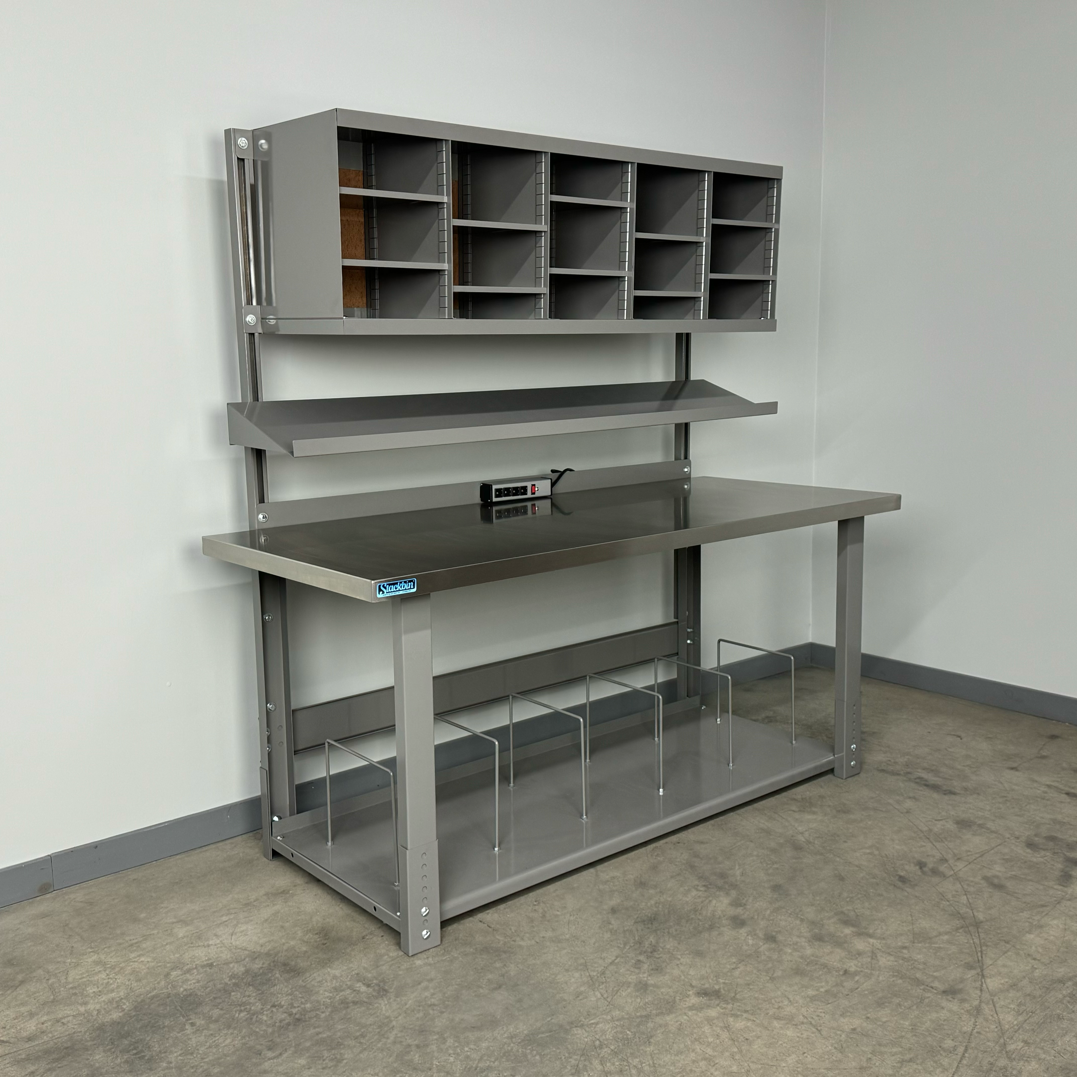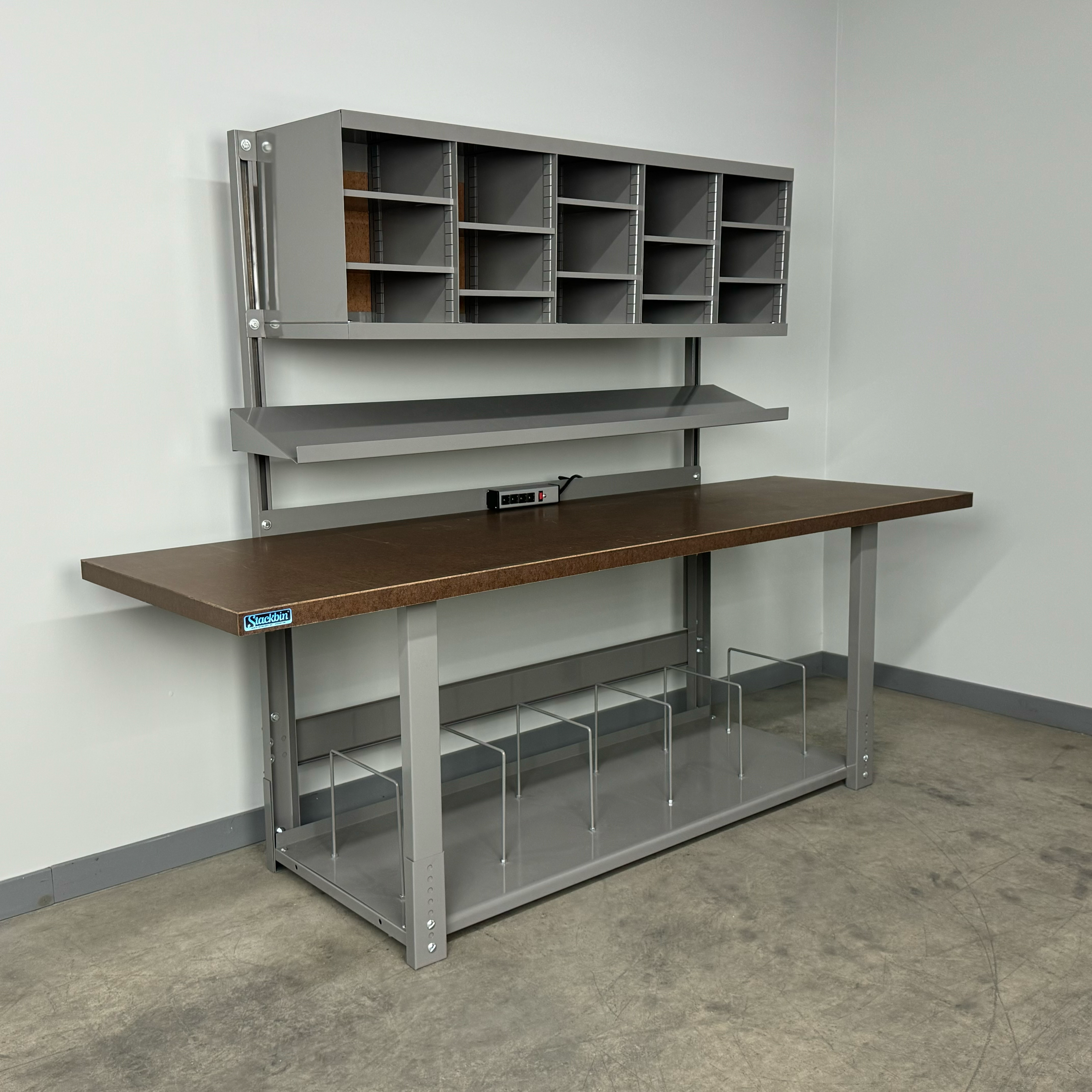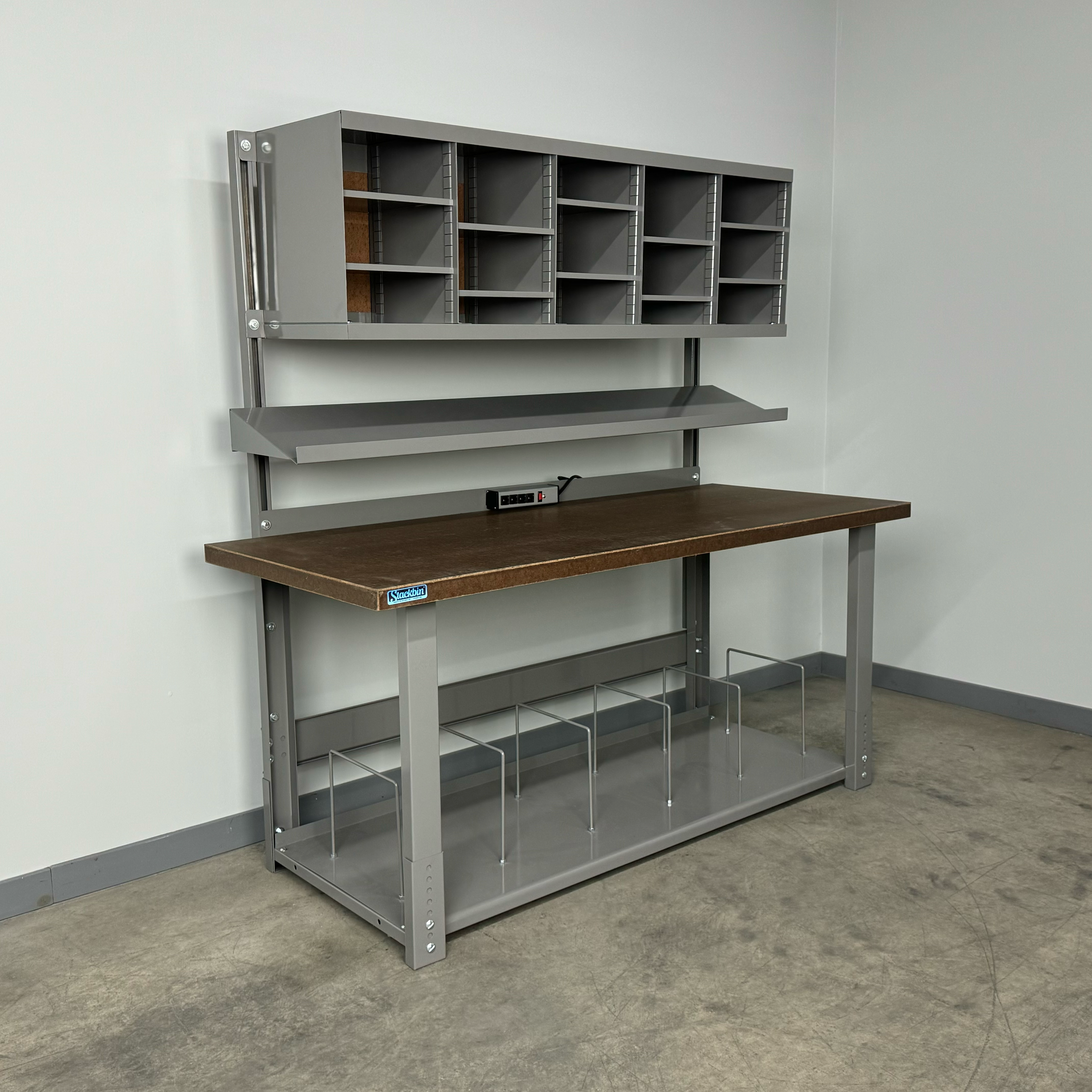 Boost productivity and keep supplies organized with this durable industrial workbench designed specifically for busy shipping stations. The straight overhead structure provides a clean, unobstructed workspace, while the integrated overhead sorter unit keeps labels, forms, and packaging materials within easy reach. A full-depth bottom shelf adds generous storage capacity for cartons, void fill, and essential tools, helping your team pack faster and smarter.