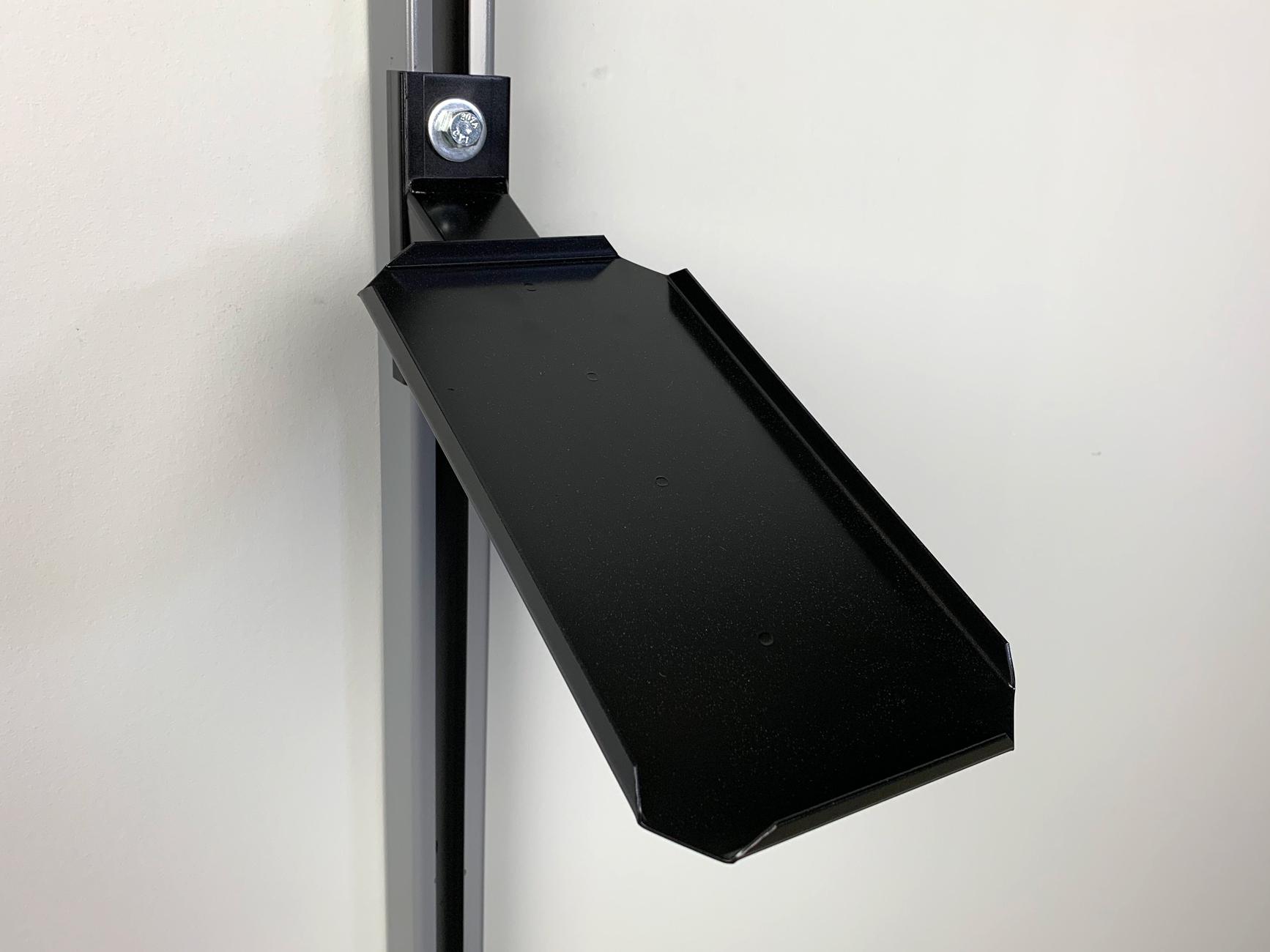 This 5-1/2" x 10" Scanning Device Tray is a great way to store scan guns, other types of scanning devices or even cell phones off of the work surface but easily accessible. It is height adjustable on the channel upright you install it on, typically the StackStrut uprights on our workstation overheads, but it also works on UniStrut and 80/20 extruded aluminum applications.