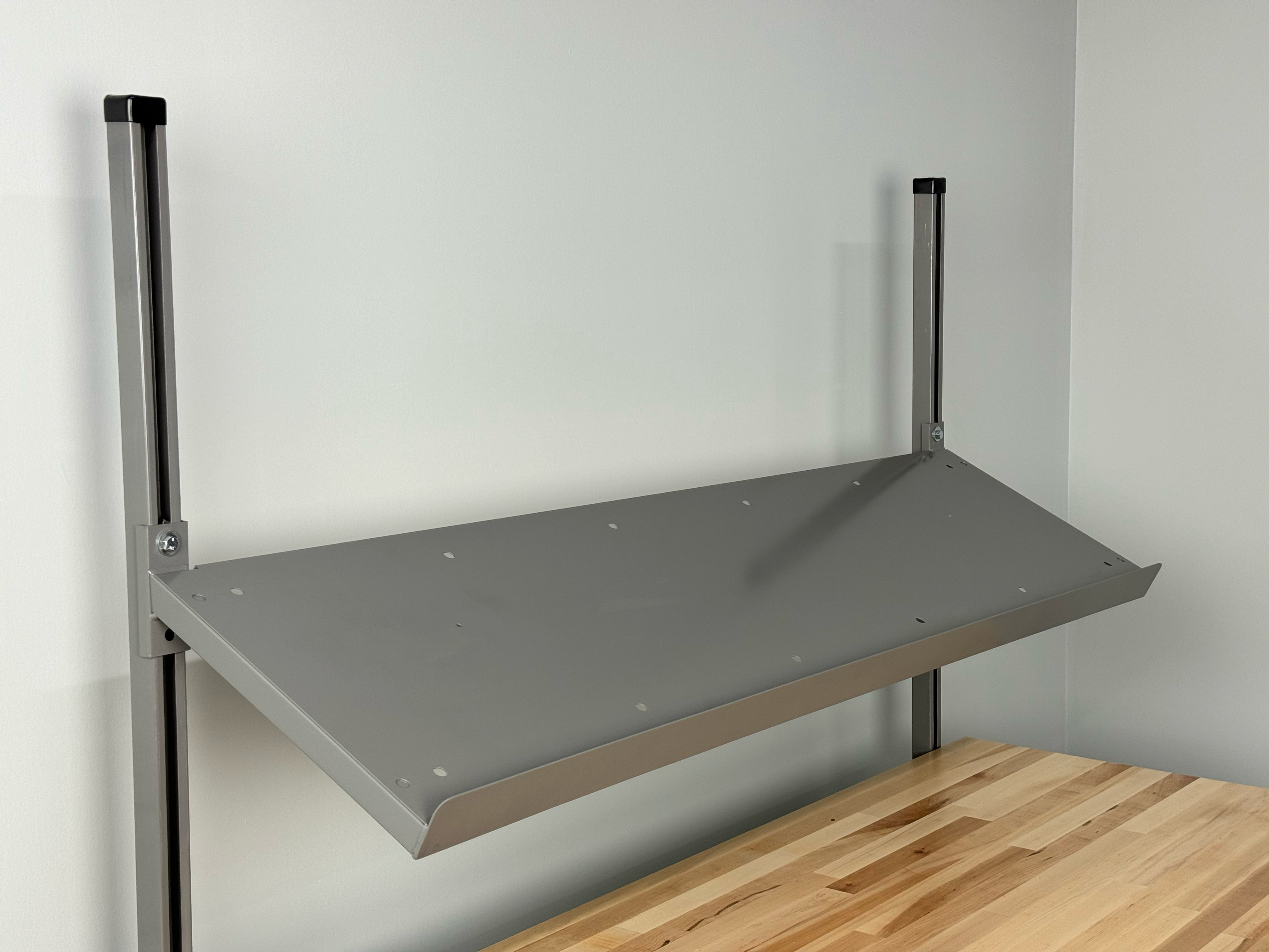 This versatile shelf mounts seamlessly to any workstation equipped with a split overhead structure, making it an ideal addition to your adjustable shelf system. The thoughtful angled design combined with a secure front lip ensures that boxes and totes stay firmly in place during operation, preventing accidental spills or shifts.