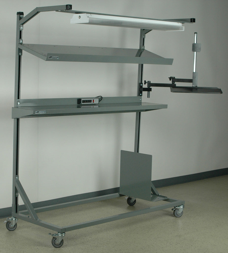 This conveyor workstation is set up for for most applications when needing a computer in the process. The 16" deep angled shelf with front lip is ideal when the storage of boxes or totes is necessary, and the 12" flat steel shelf with rear lip is handy for the storage of other items. (4) 330# cap. rubber over steel casters are included along with the flat screen monitor arm, 4 outlet strip, and cpu holder which can mount on the left or right side of the unit.