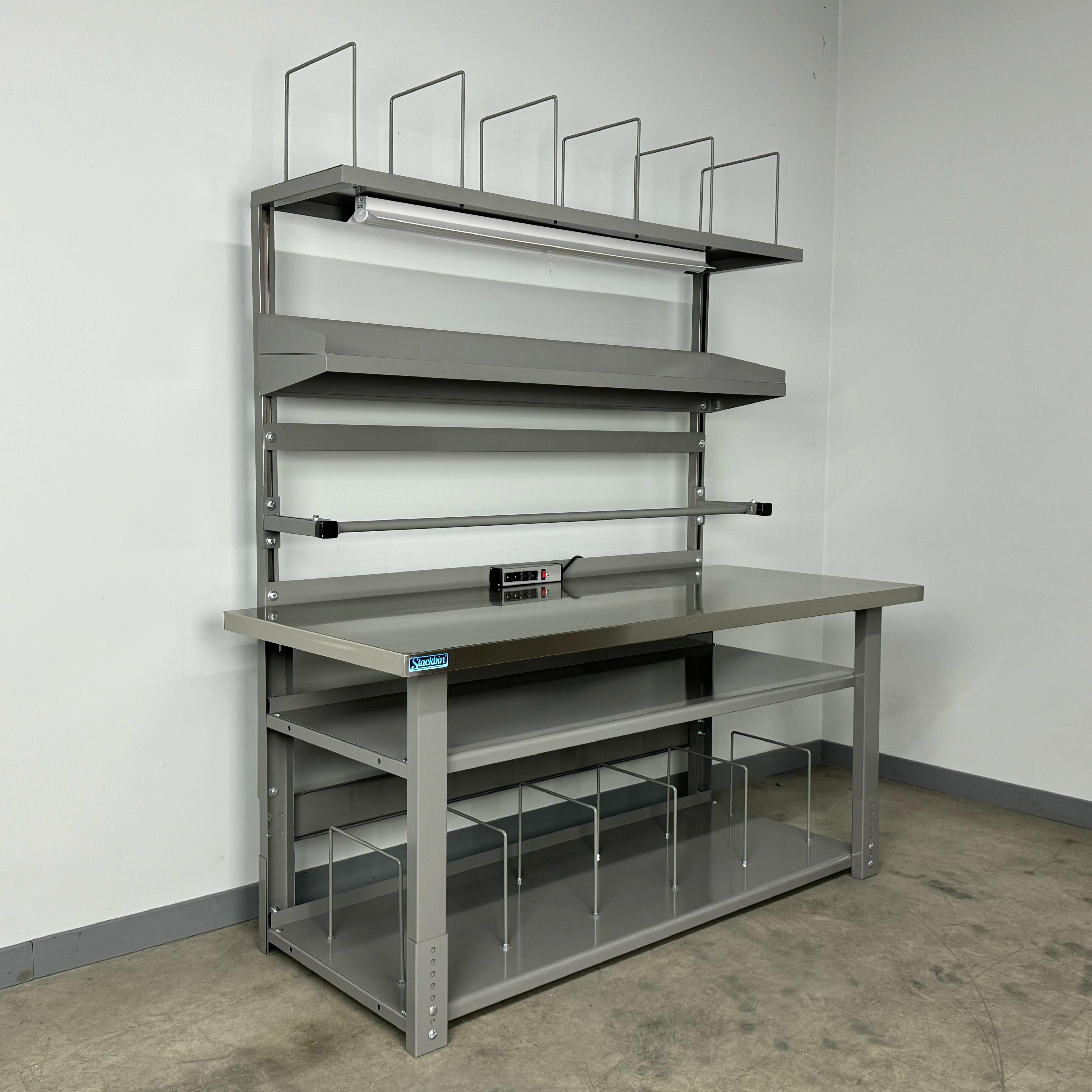 This heavy duty workbench is engineered for maximum efficiency in shipping and packaging operations. Built with durability in mind, this custom workbench features a straight overhead structure with a fixed top shelf for convenient carton storage and two full-depth bottom shelves that provide exceptional organization capabilities.