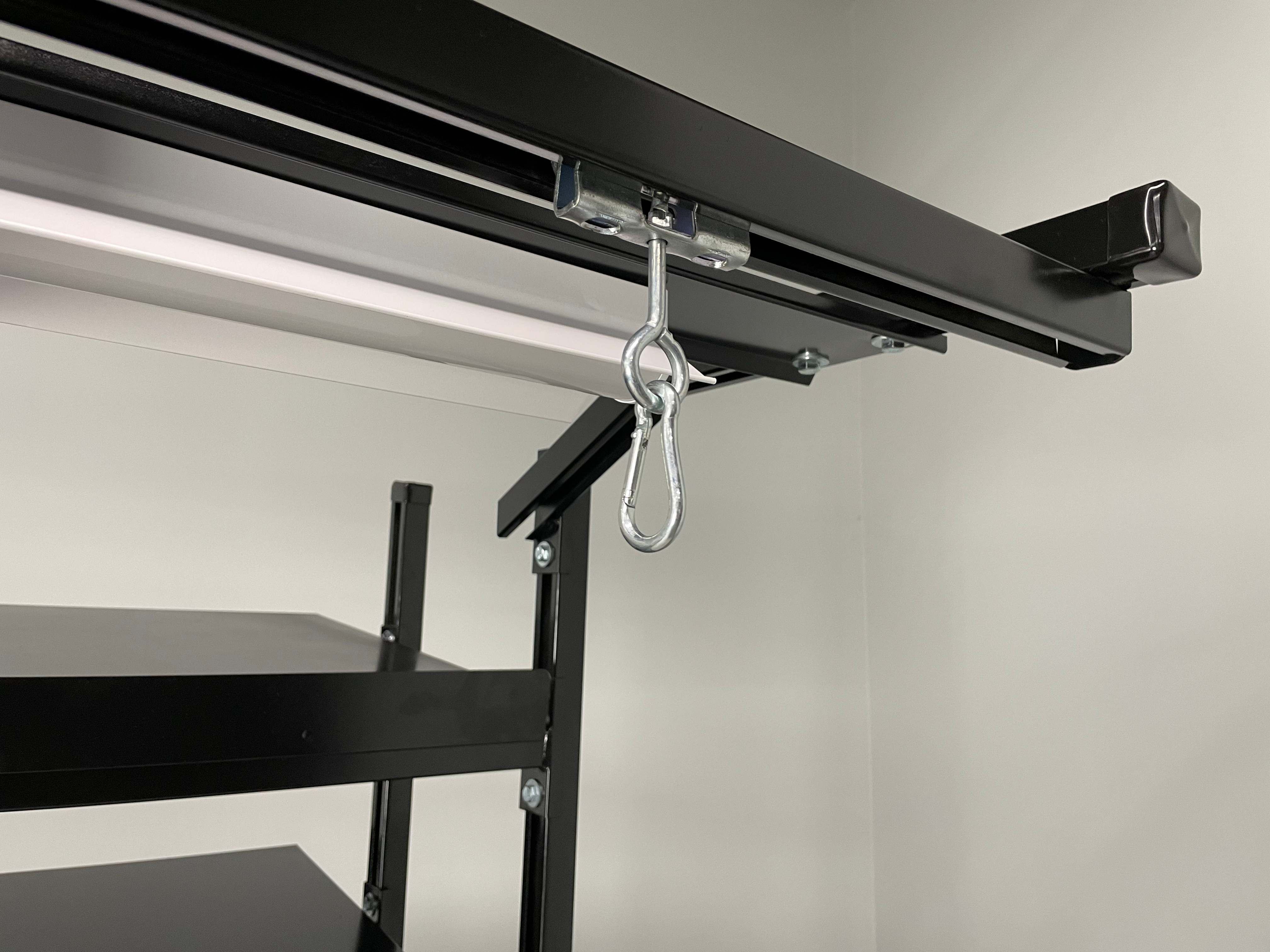 Each track includes a smooth-gliding trolley plus end-of-rail stops for safe, controlled movement. When ordered with a Stackbin workstation, the cantilevered arms are extended to position the track over more usable work area, and a compatible light fixture can be added to brighten your workflow. The trolley comes equipped with a carabiner for easy attachment of a retractable balancer, keeping frequently used tools suspended and within reach.